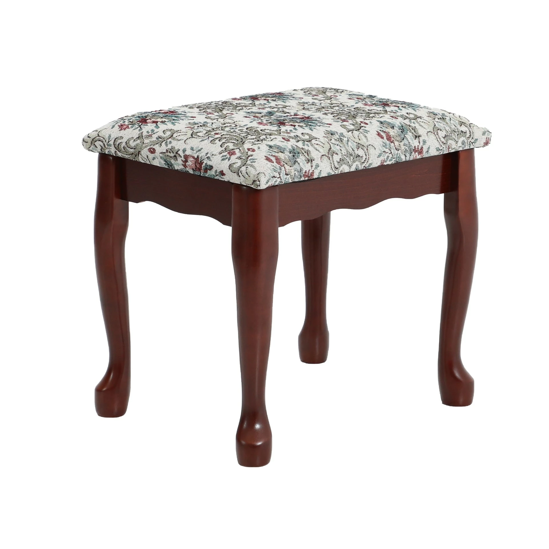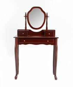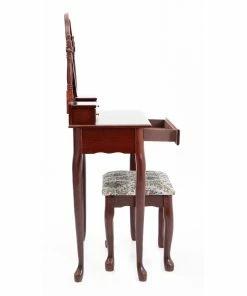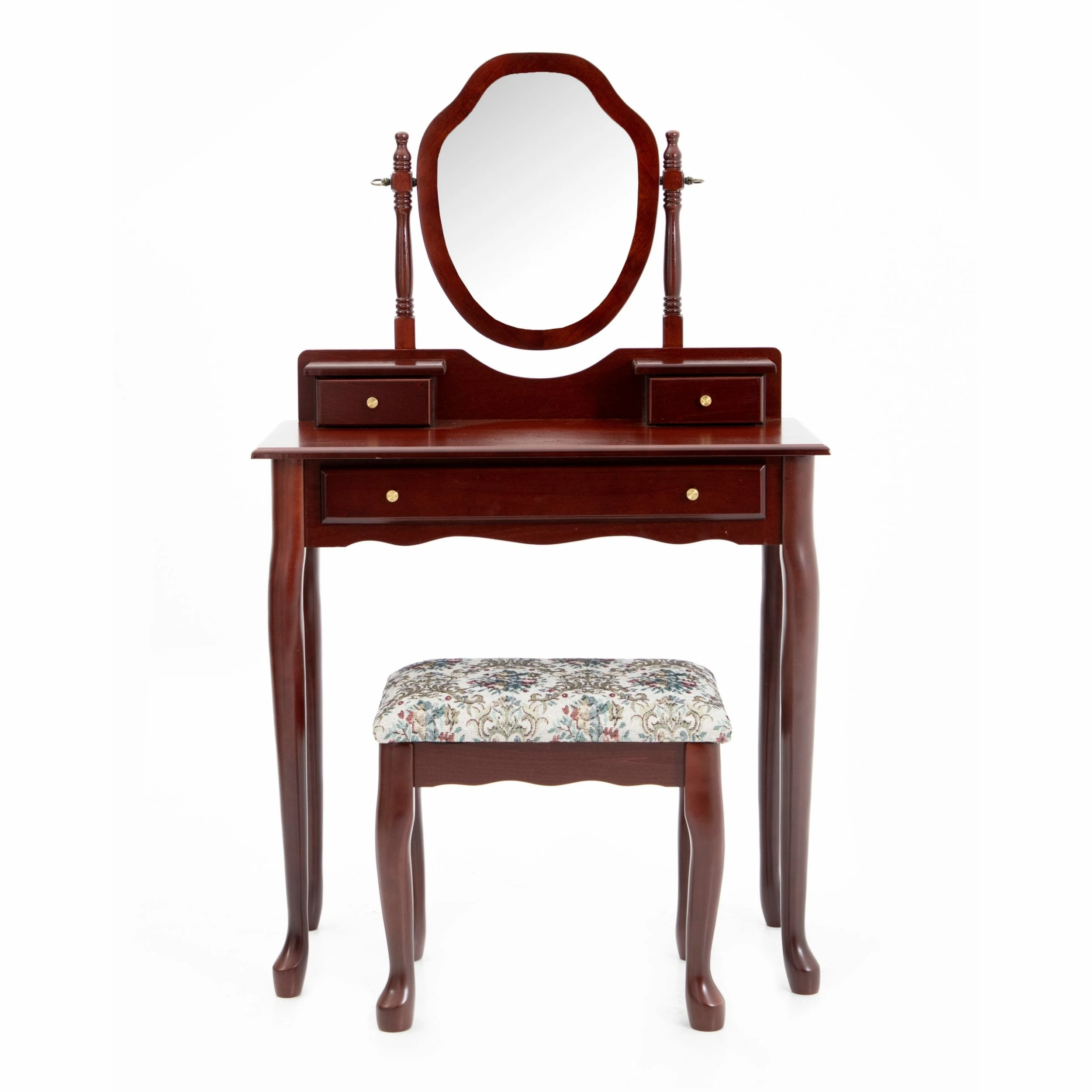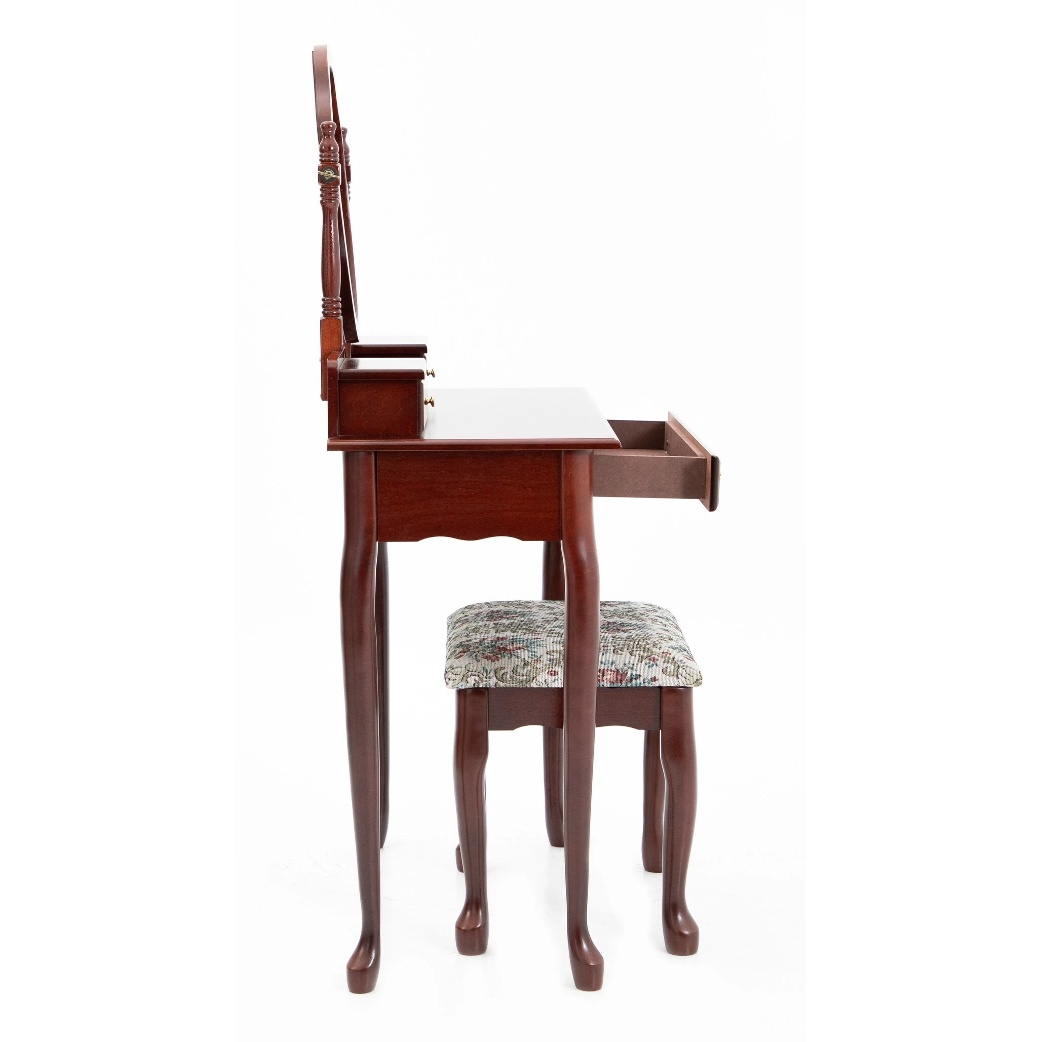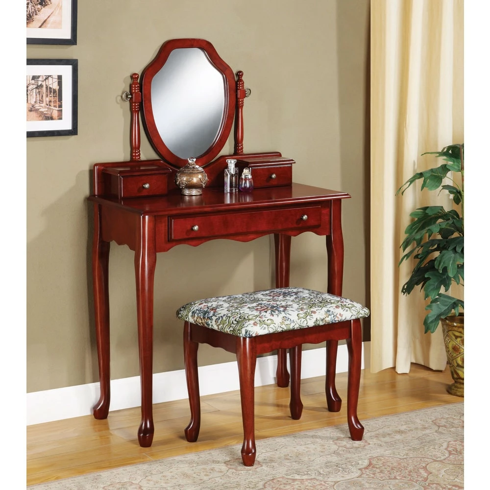Create a calming place to dress with this Traditional Vanity and Stool with Tapestry Fabric Seat, featuring a generous top surface with two small drawers for small essentials and a lower drawer for additional storage of make-up and hair care products. A lovely shield shaped swivel mirror is attached, adding light and depth to your room. A pretty shaped apron and elegant cabriole legs complete this vanity, all in a warm Cherry finish, accented with simple gold tone metal knobs. The matching stool has the same elegant cabriole legs and a soft tapestry fabric covered seat for a regal look and feel.