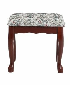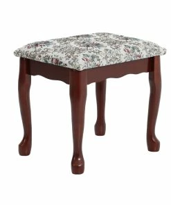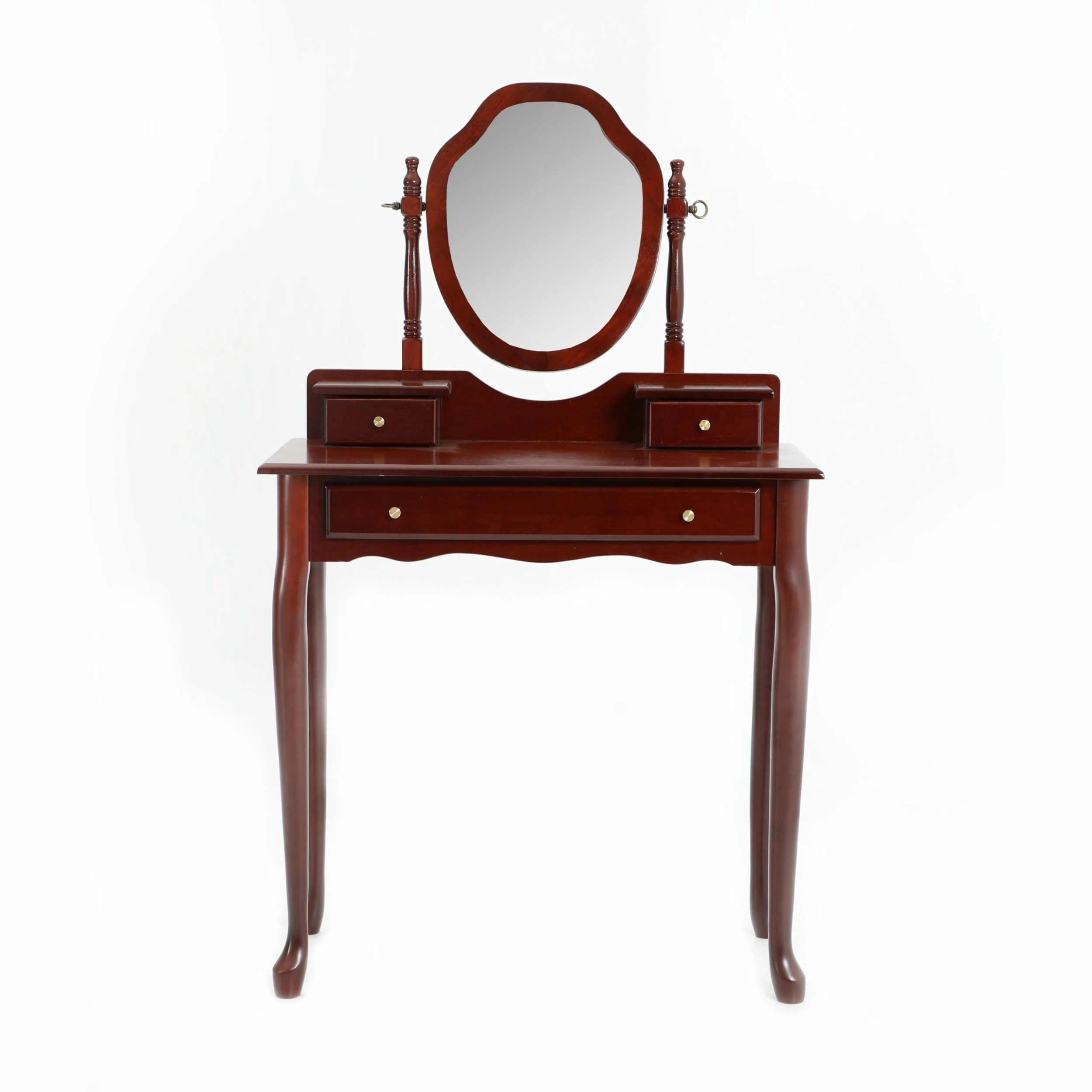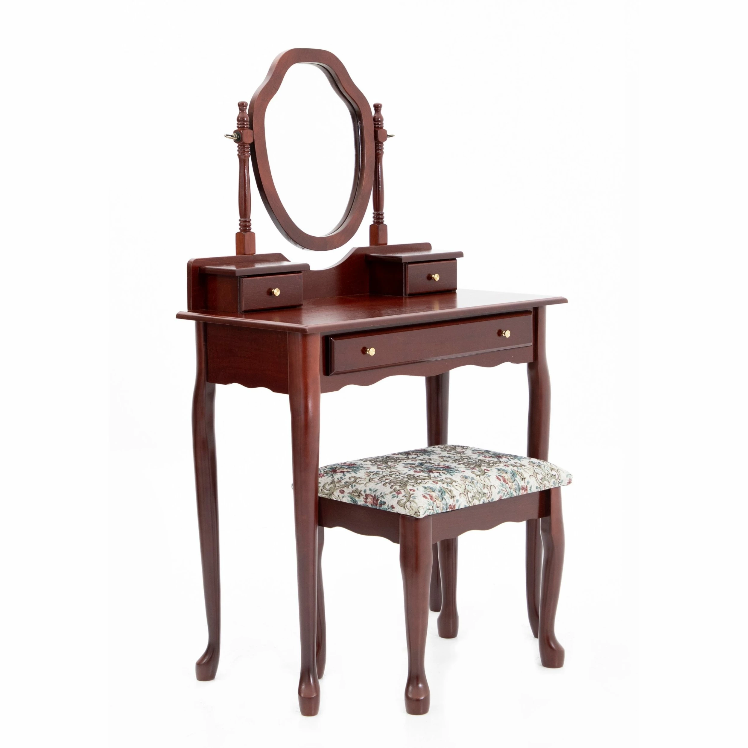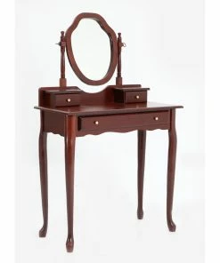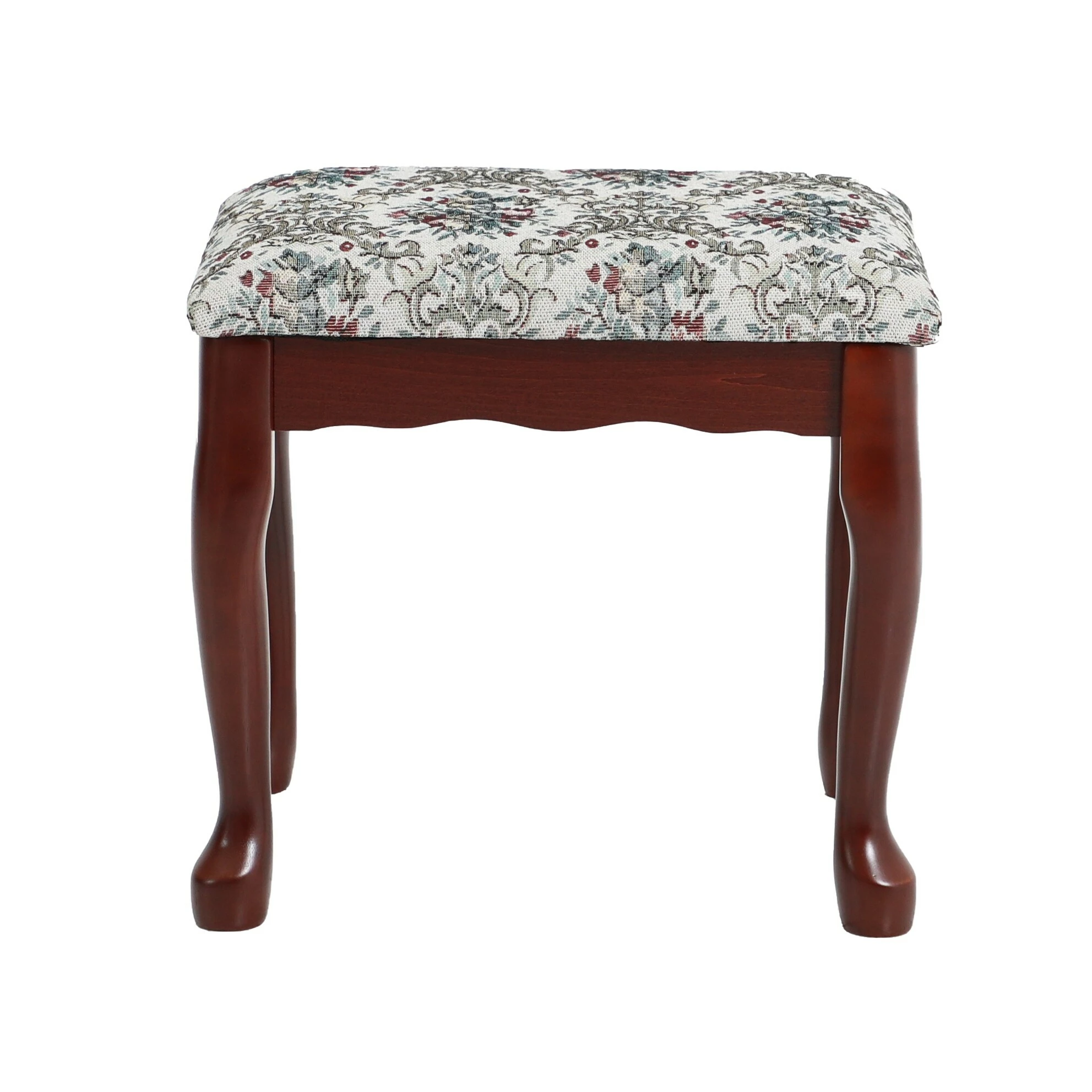 Create a calming place to dress with this Traditional Vanity and Stool with Tapestry Fabric Seat, featuring a generous top surface with two small drawers for small essentials and a lower drawer for additional storage of make-up and hair care products. A lovely shield shaped swivel mirror is attached, adding light and depth to your room. A pretty shaped apron and elegant cabriole legs complete this vanity, all in a warm Cherry finish, accented with simple gold tone metal knobs. The matching stool has the same elegant cabriole legs and a soft tapestry fabric covered seat for a regal look and feel.