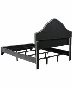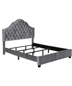 Create your ideal royal slumber chambers with this magnificent upholstered bed. Exceptionally elegant from all aspects, this piece is entirely upholstered in a luxurious grey velvet fabric. A dramatic camelback style headboard creates an unforgettable impression along with additional comfort. Button tufting further enhances its appearance while nail head trim adorns the frame. This piece includes a low profile headboard and sturdy tapered feet.