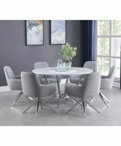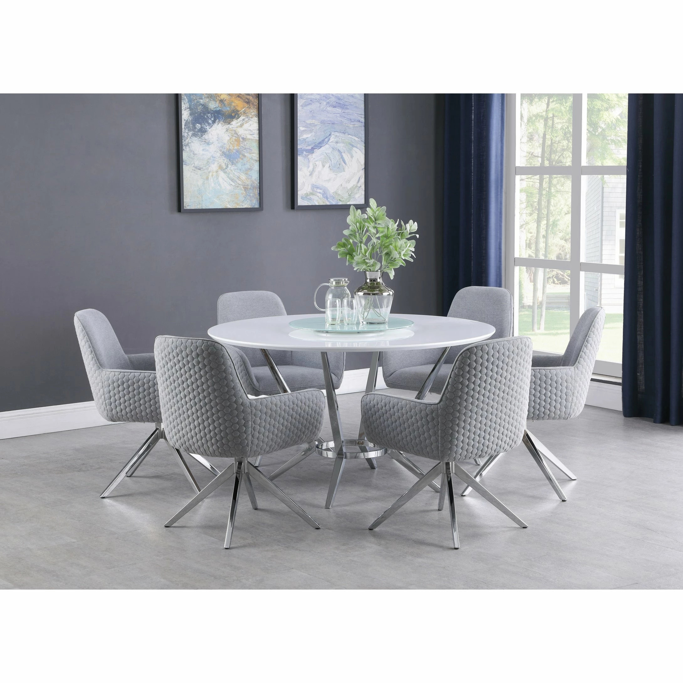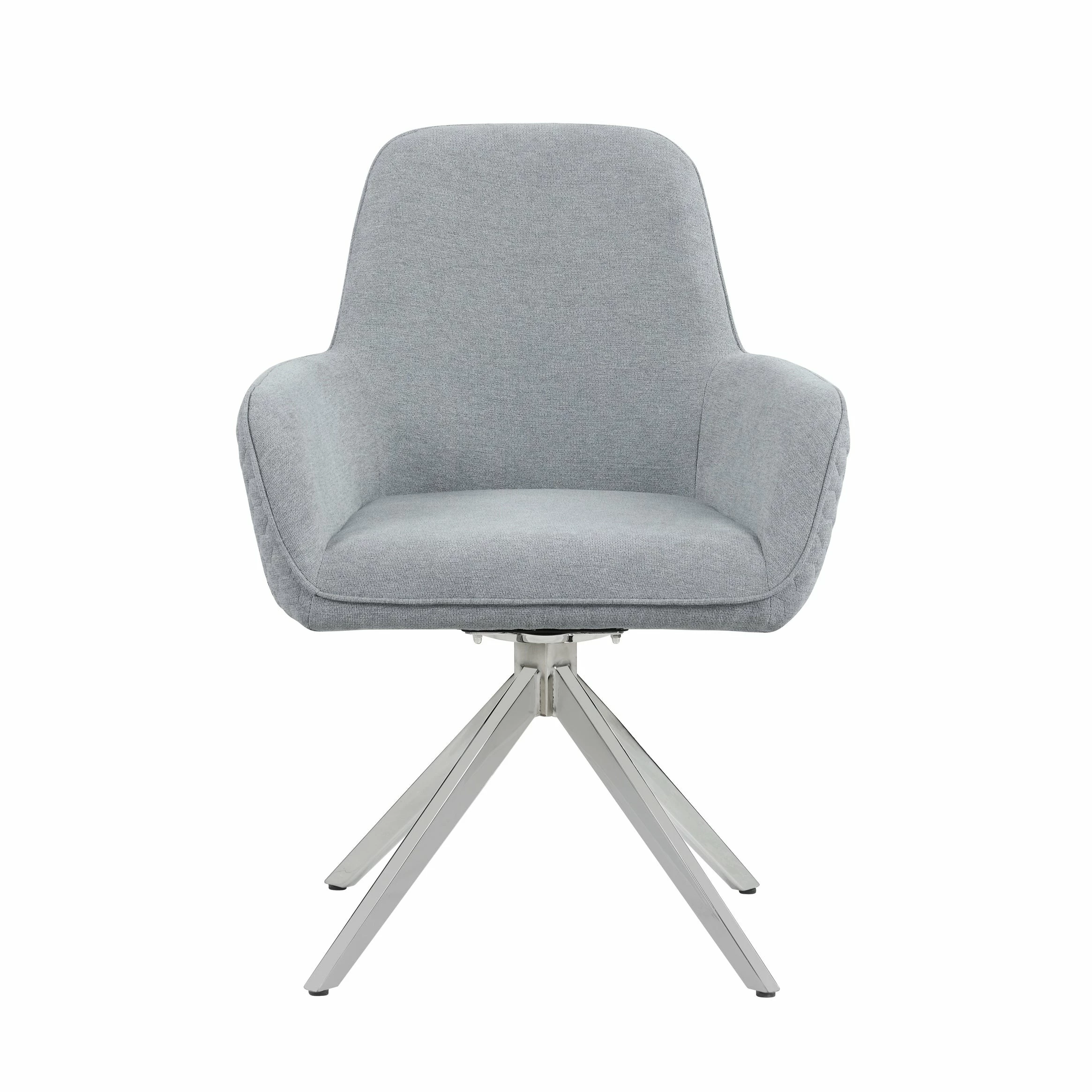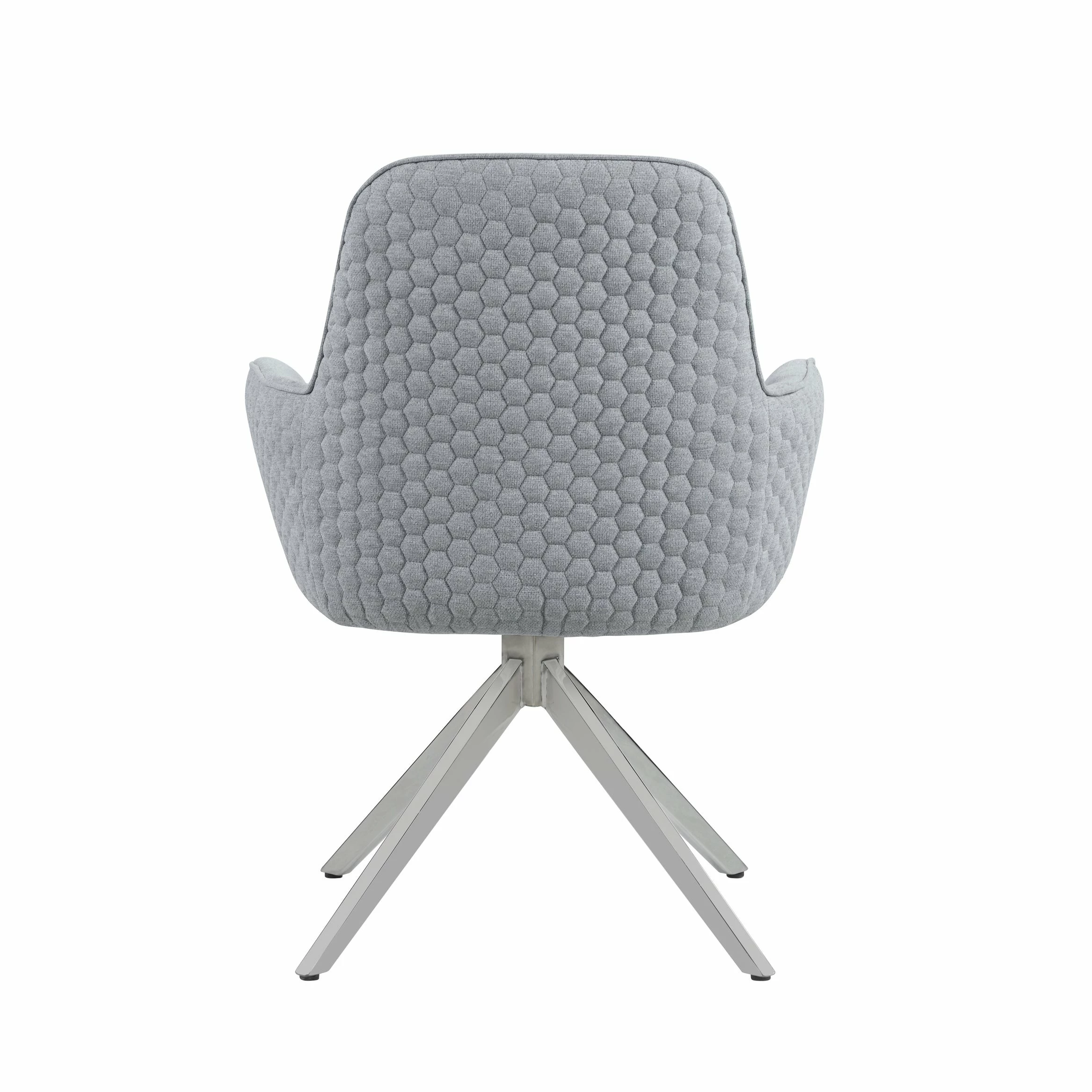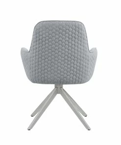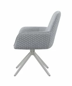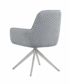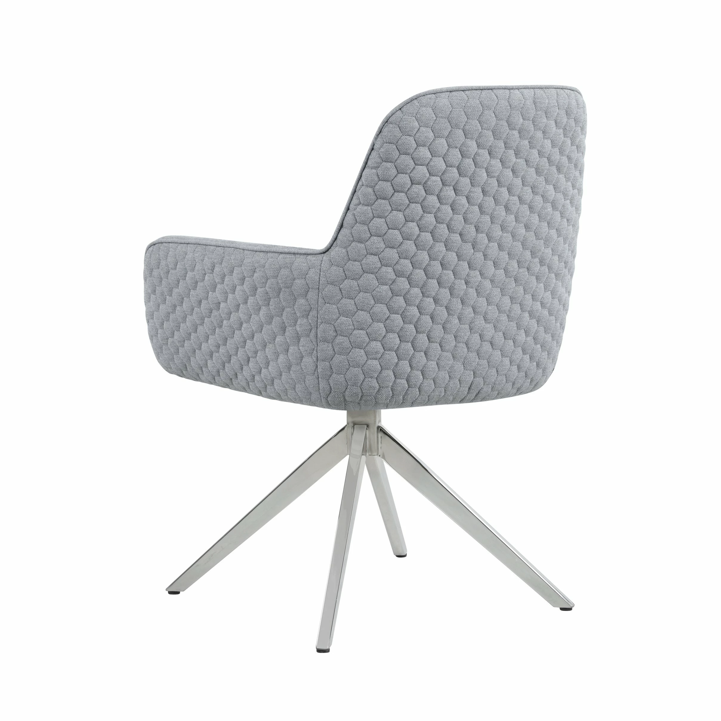 This contemporary dining chair is the perfect addition to casual or formal dining table and room. With a Mid Century modern style bucket seat design, it features elegant low arms and a tall backrest for long-lasting support. Plus, with a 360-degree swivel base in a shiny chrome finish, you can easily get in and out to retrieve drinks or food. Its upholstered seat is wrapped in a light grey fabric with a honeycomb quilted exterior. Available in the same Abby collection is a matching chrome dining table.
