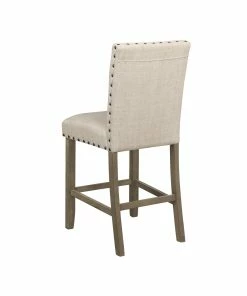 Freshen up your farmhouse kitchen with these comfy counter-height stools. The rustic brown hardwood frames are upholstered with beige linen-like fabric, and fitted with footrests for added support. Bronzed nail head trim lines the seat and back for a hint of texture and shine.