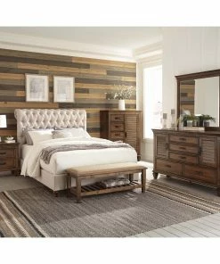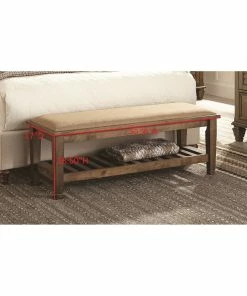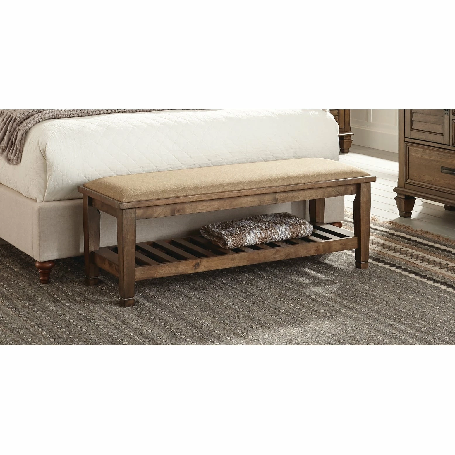 Stylish and practical, this versatile bench is a stunning complement to your room. With a beautiful, burnished oak finish, it boasts a cool, classic aesthetic. Its plush seat cushion is upholstered in soft beige fabric with a lush, luxurious texture. A built-in storage shelf underneath features slatted design adds even more convenience. Place it at the foot of your bed or move around for added comfort.