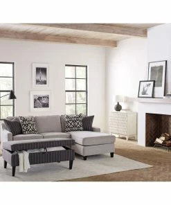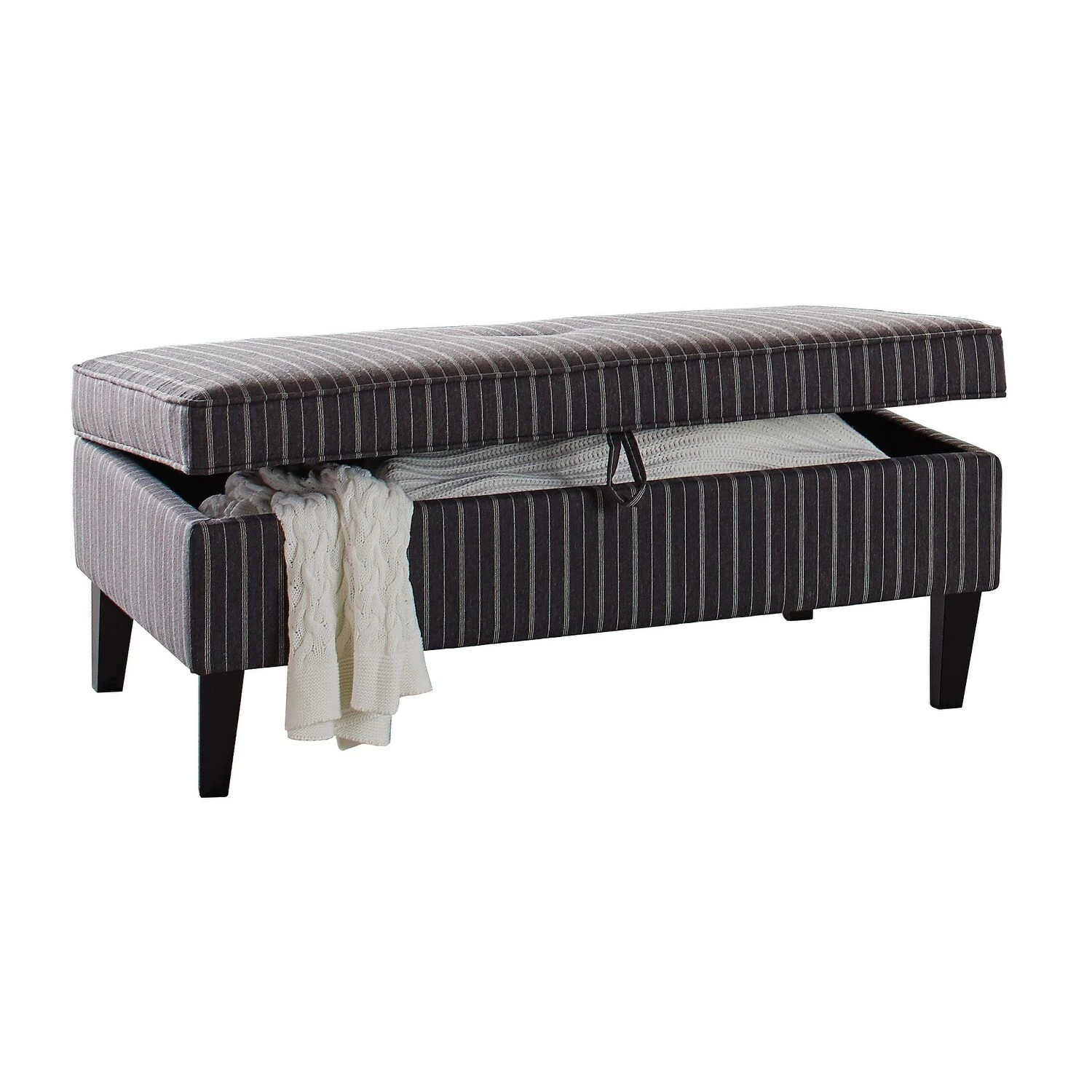 Perfect for a contemporary space, this transitional storage ottoman offers a versatile, thoughtful design. Store throws, pillows and more inside, retrieving them easily by lifting the top cushion. Wrapped in a woven fabric with black undertones and white pin stripes, this ottoman lends itself to a variety of color palettes with its contrasting hues. Elevated by long tapered legs in a dark brown finish, it offers space beneath for storage baskets too. Place this ottoman in front of a sofa or sectional for a place to rest your tired feet or a refreshment tray.