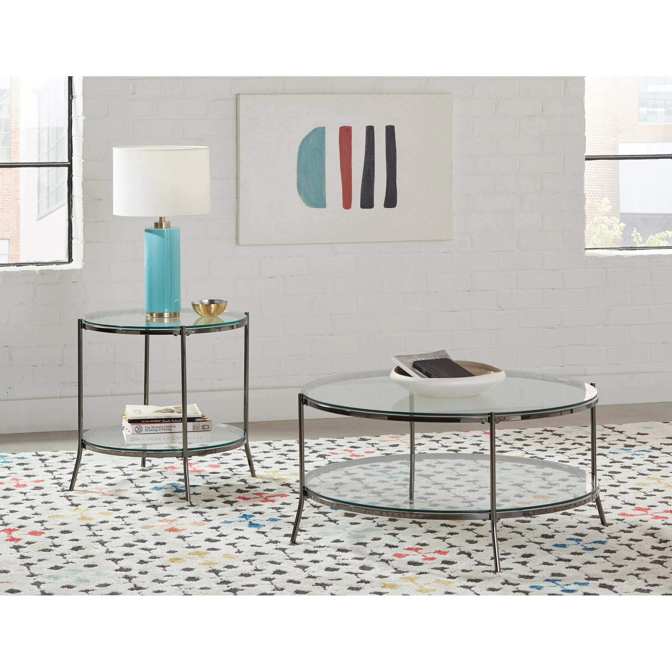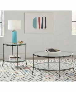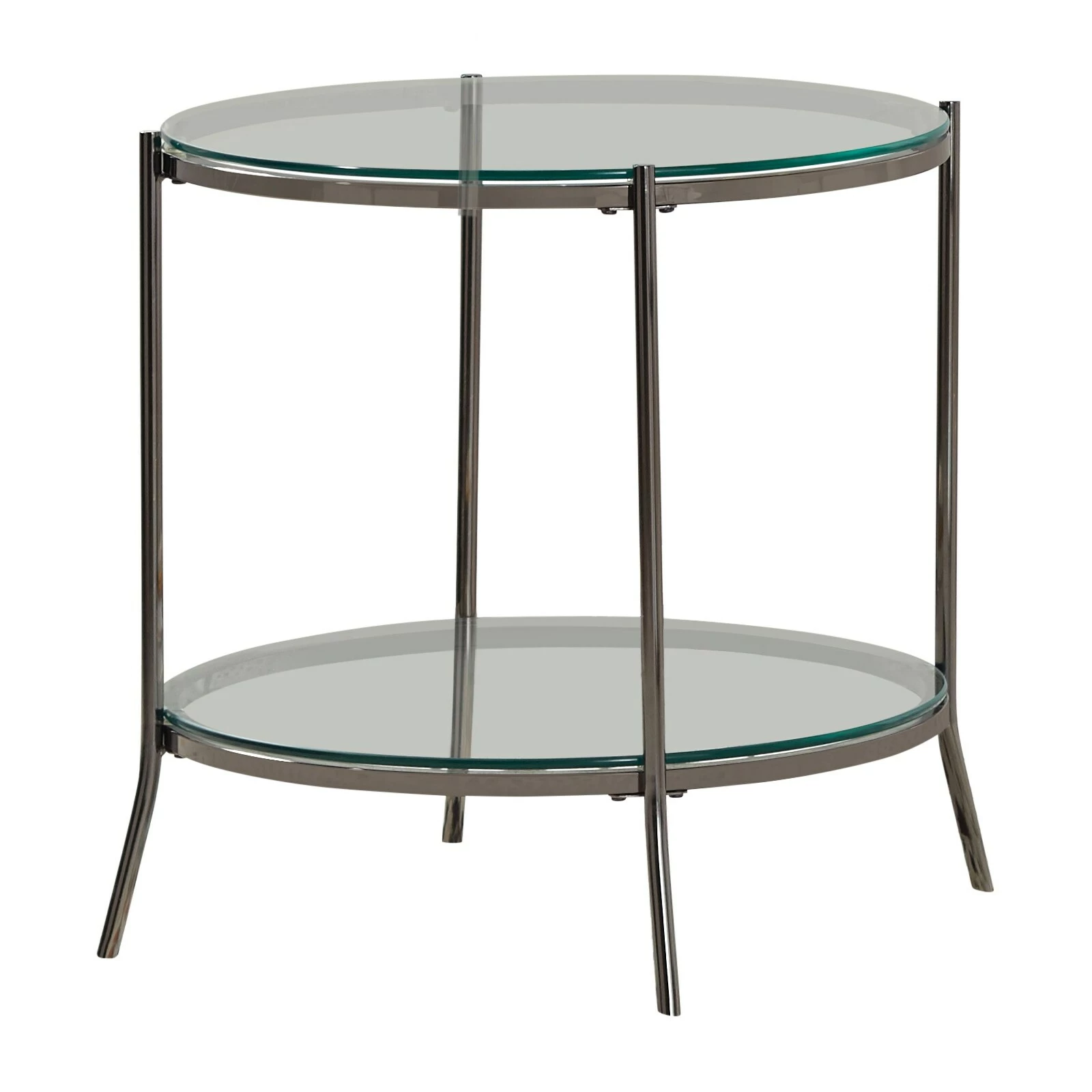 The sleek lines and open and airy design of this end table elevate and refine any seating area. Flanking a sofa or nestled beside an accent chair, this contemporary end table exudes a confident modern flair in its simplistic shape and style. Featuring a round shape, complete with a clear tempered glass tabletop and bottom shelf, this end table offers an elegant nature that blends into its surroundings. Held together with a slim electroplated metal frame and four leg supports that flare at the foot, each in a black nickel finish, this transitional end table complements a variety of color palettes and decor. Place it in a modern living room or even a bedroom seating area.