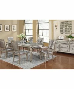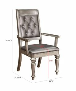 Sophisticated tufting, complete with a clear diamond button, from this glam metallic platinum armchair elevate any modern dining room. Exposed wood features a delicately beveled border, contrasting against the pillowy softness of the cushions.