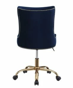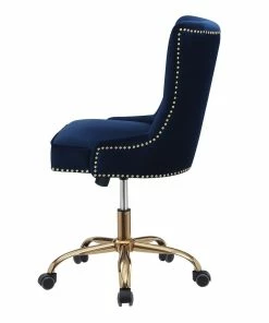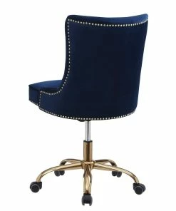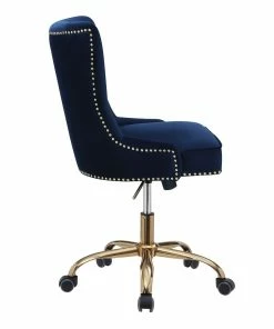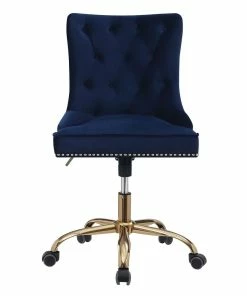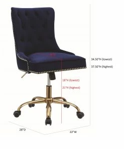 This intriguing office chair exudes regal, refined elegance. Upholstered in beautiful blue velvet, it adds a vibrant splash of color to any office space. Trendy button tufting adorns its supportive seat back, adding a touch of luxurious appeal. Cool brass accents enhance its modern silhouette, rounding it out with artistic charm. Conveniently height adjustable, this chair is complete with built-in casters and swivel functionality for versatile ease of movement.