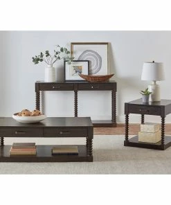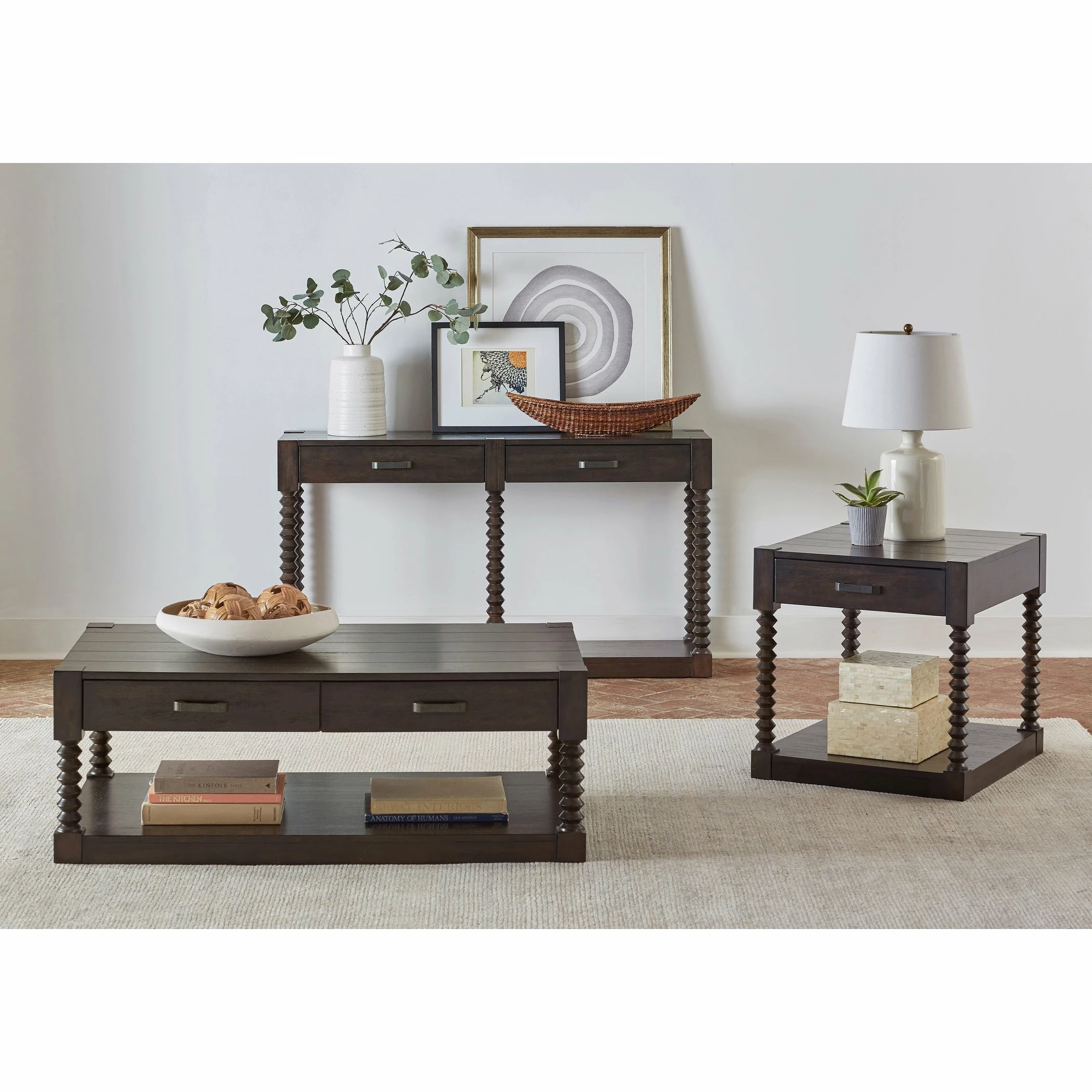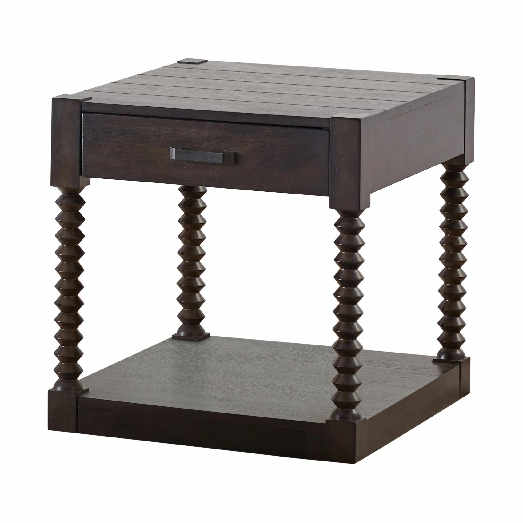 This transitional end table is the perfect addition to a modern farmhouse living room. With a coffee bean brown finish throughout, it lends itself to a variety of rustic color palettes. Adding a visual statement are spindle style legs and a plank style tabletop surface, spacious enough for table lamps and decor. Keep remotes and reading material nearby in a single top drawer, adorned with a long drawer handle in a gunmetal finish. In addition, this transitional end table offers ample space beneath with a bottom shelf for showcasing decor or keeping a basket of throws.