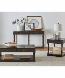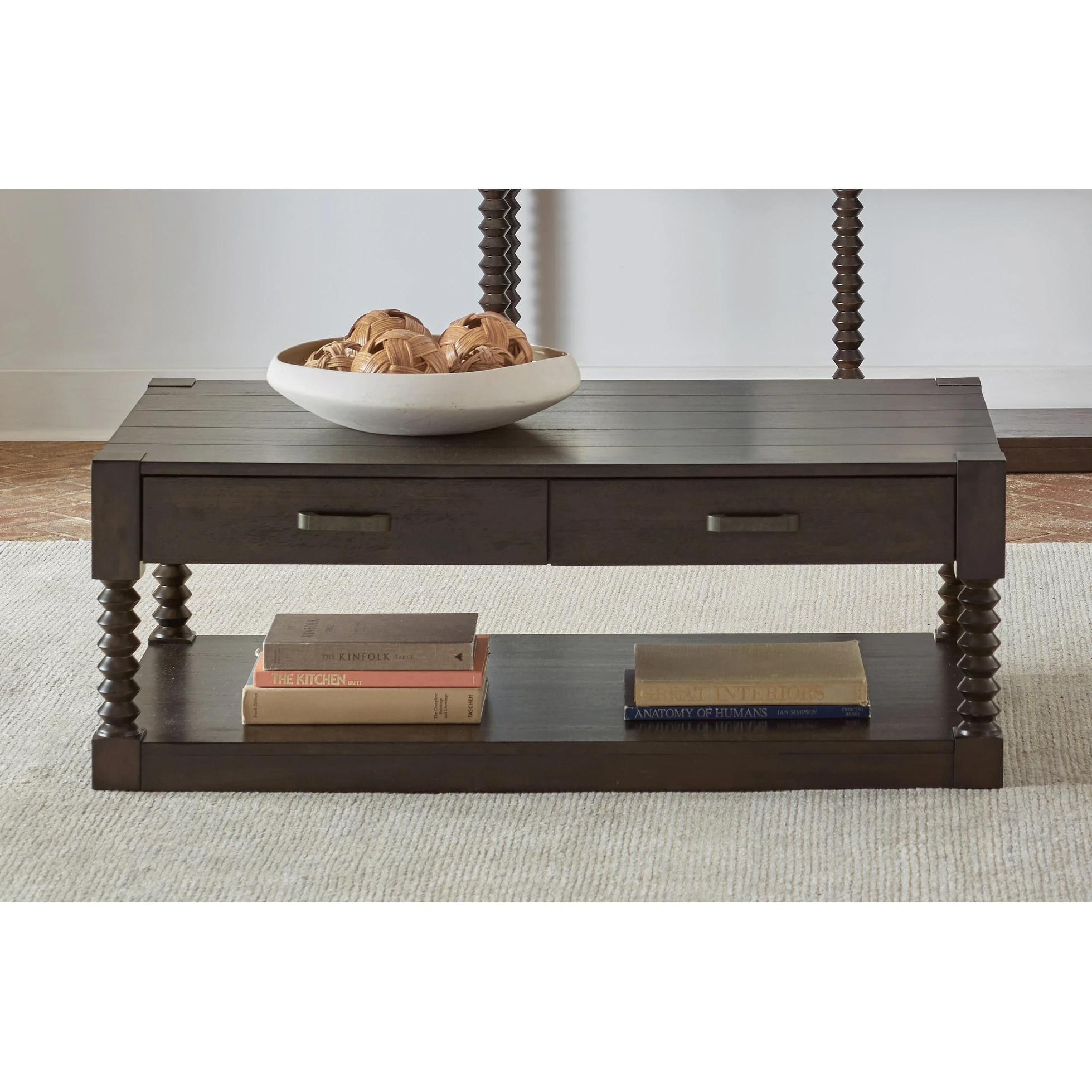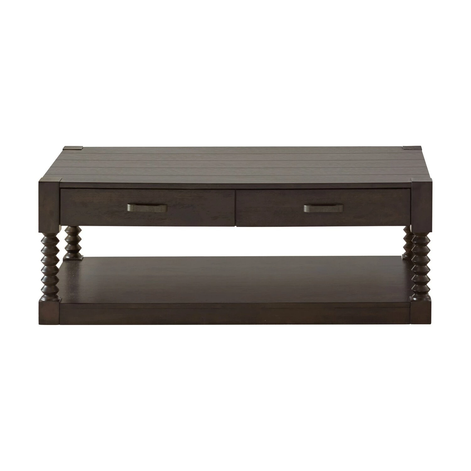 Striking and bold, this transitional coffee table lends a rustic flair to your home with its dark-tone coffee bean finish. With a spacious plank style tabletop and spindle style leg supports, this coffee table offers a modern farmhouse look that is sure to be noticed. Keep reading material, refreshments and essentials close by, placing this coffee table in front of a sofa or sectional. With two slim drawers and an open bottom shelf, it also provides ample storage for both hidden remotes and showcased decor. Two long metal hardware pieces in a gunmetal finish further lend to the rustic touches.