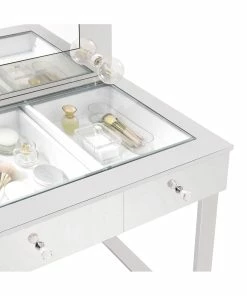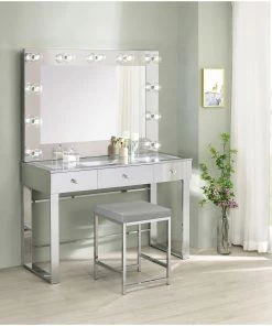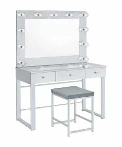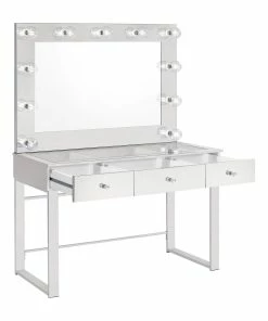 With a Hollywood regency flair, this modern vanity set features a stunning mirror paneled design that reflects surrounding hues. Cleverly designed with a clear tempered glass top that showcases cosmetics and accessories tucked inside the three drawers beneath, this vanity offers a unique functionality. Adorned on each of the three bright white drawers are crystal-like acrylic pulls, further lending to its dramatic glam flair. Mounted on the back is an oversized mirror framed in a mirror-like polished chrome metal finish, complete with a series of retro-inspired, Edison-style LED bulbs. Constructed with a heavy gauge steel base, this vanity set is made to last.