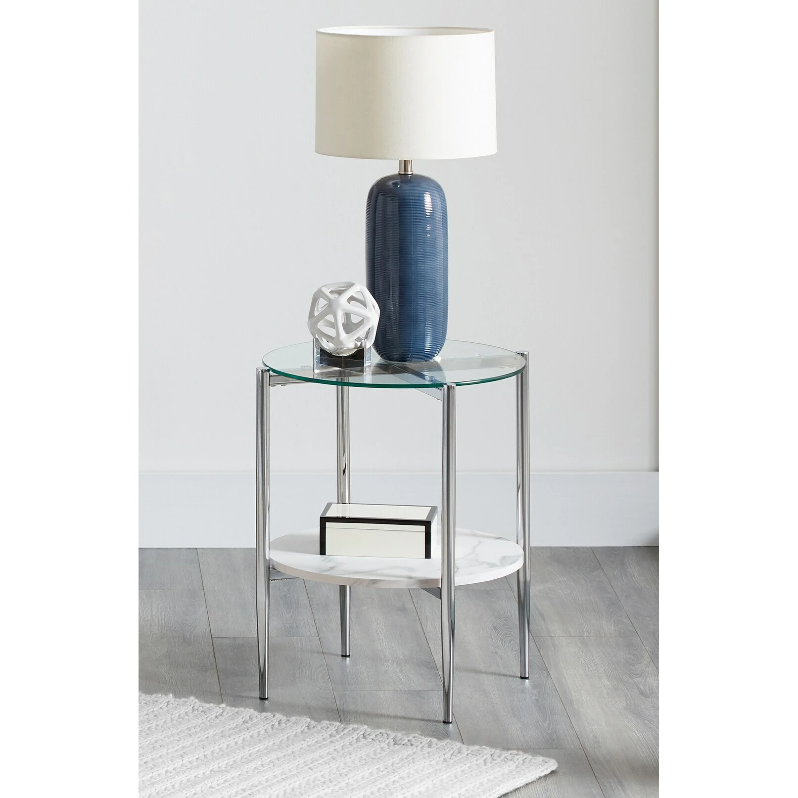 Sleek and sophisticated, this round end table offers incredible construction for a chic addition in your living space. The round tabletop is enhanced with glass to perfectly place a small table lamp or house plant. The center shelf is elegantly crafted from faux marble in hues of white and grey. Place your favorite decor piece on the top or bottom shelf and watch this glass end table enhance your space. Consider pairing this piece with a matching coffee table to complete the look.