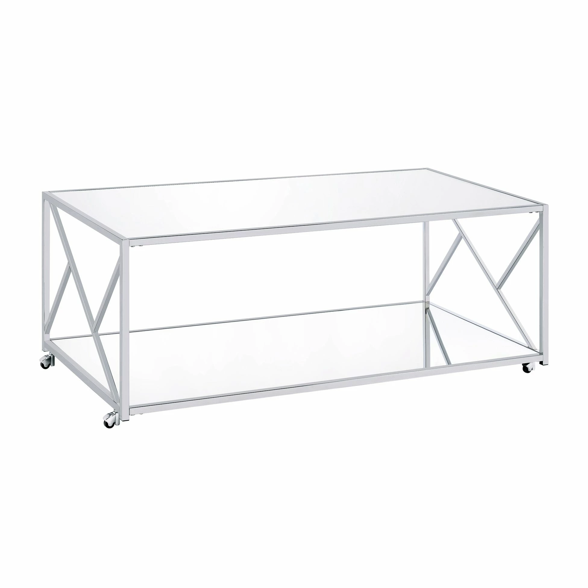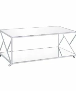 - Coffee table features a mirrored shelf and casters for mobility