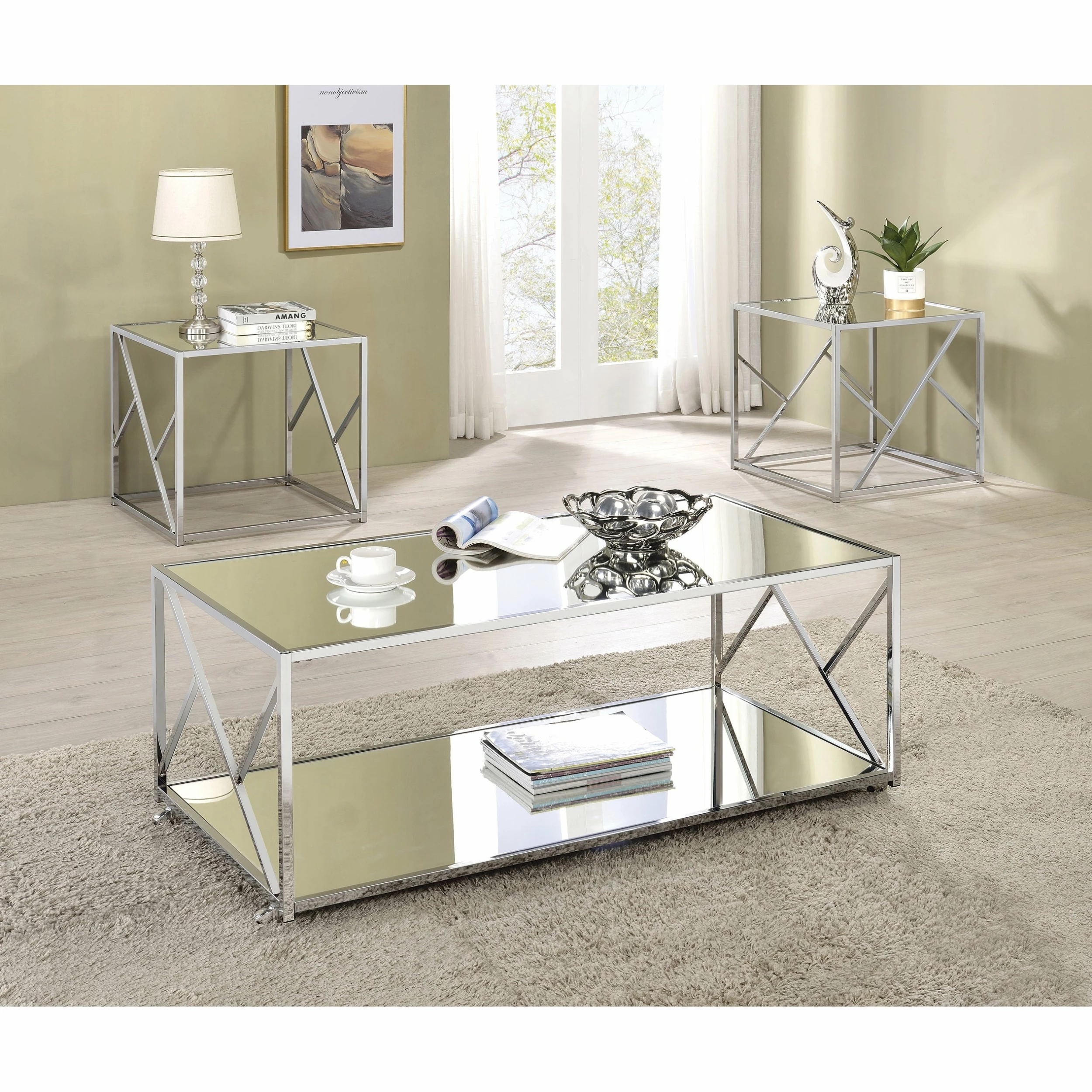 Makeover your living space with a three-piece occasional set. This spectacular set showcases contemporary appeal from all angles, including its contemporary base. Coming with two end tables and one coffee table, your living area will feel complete and stylish. The mirrored tabletops make a notable impression in combination of the base. Finished in chrome, the possibilities of this set are endless.
