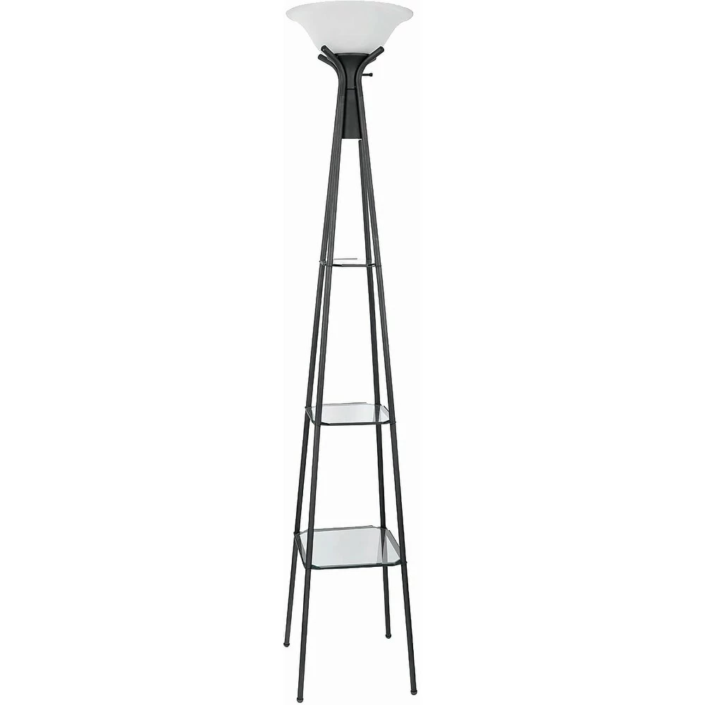 Admire your fresh decor when you set up this Coaster Company floor lamp. Black metal forms a pyramid-style shape to create an eye-pleasing silhouette, and integrated clear glass shelves add stability and give you a spot for decor pieces. The frosted-glass shade adds a warm glow at the top of this floor lamp.