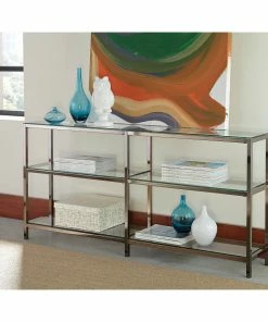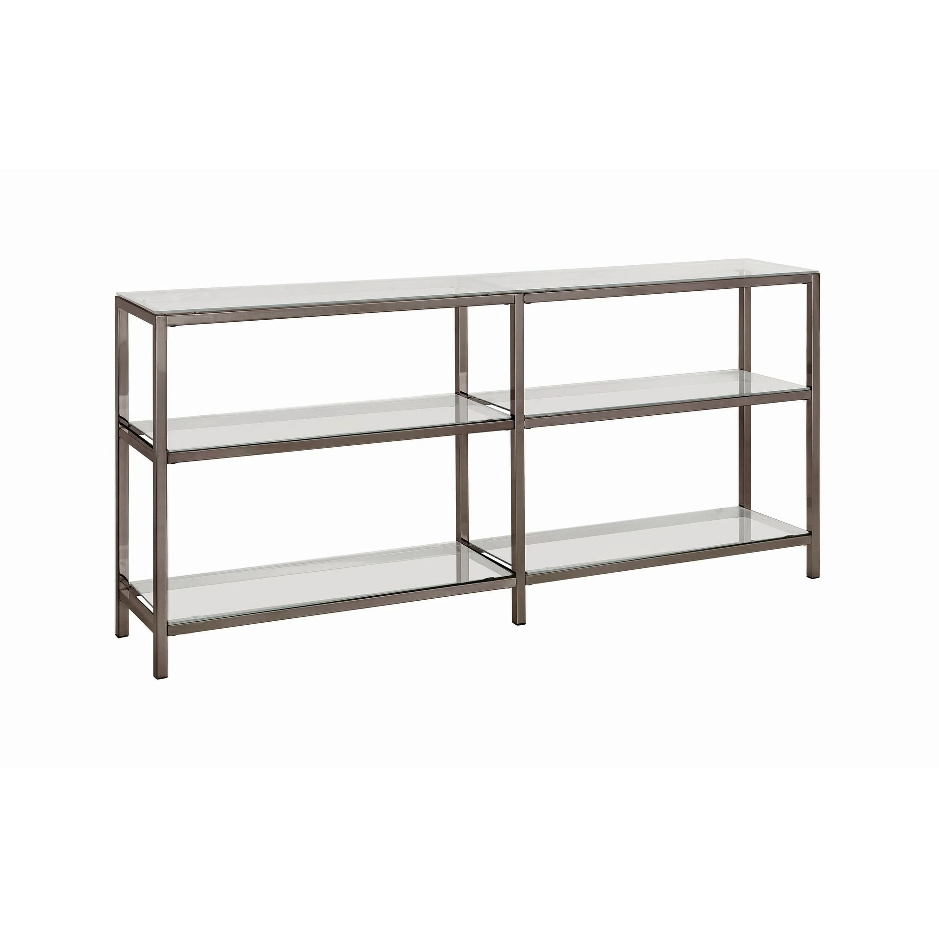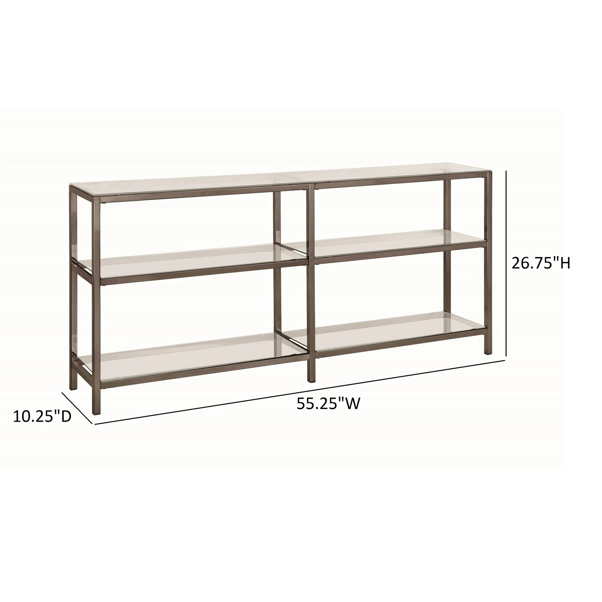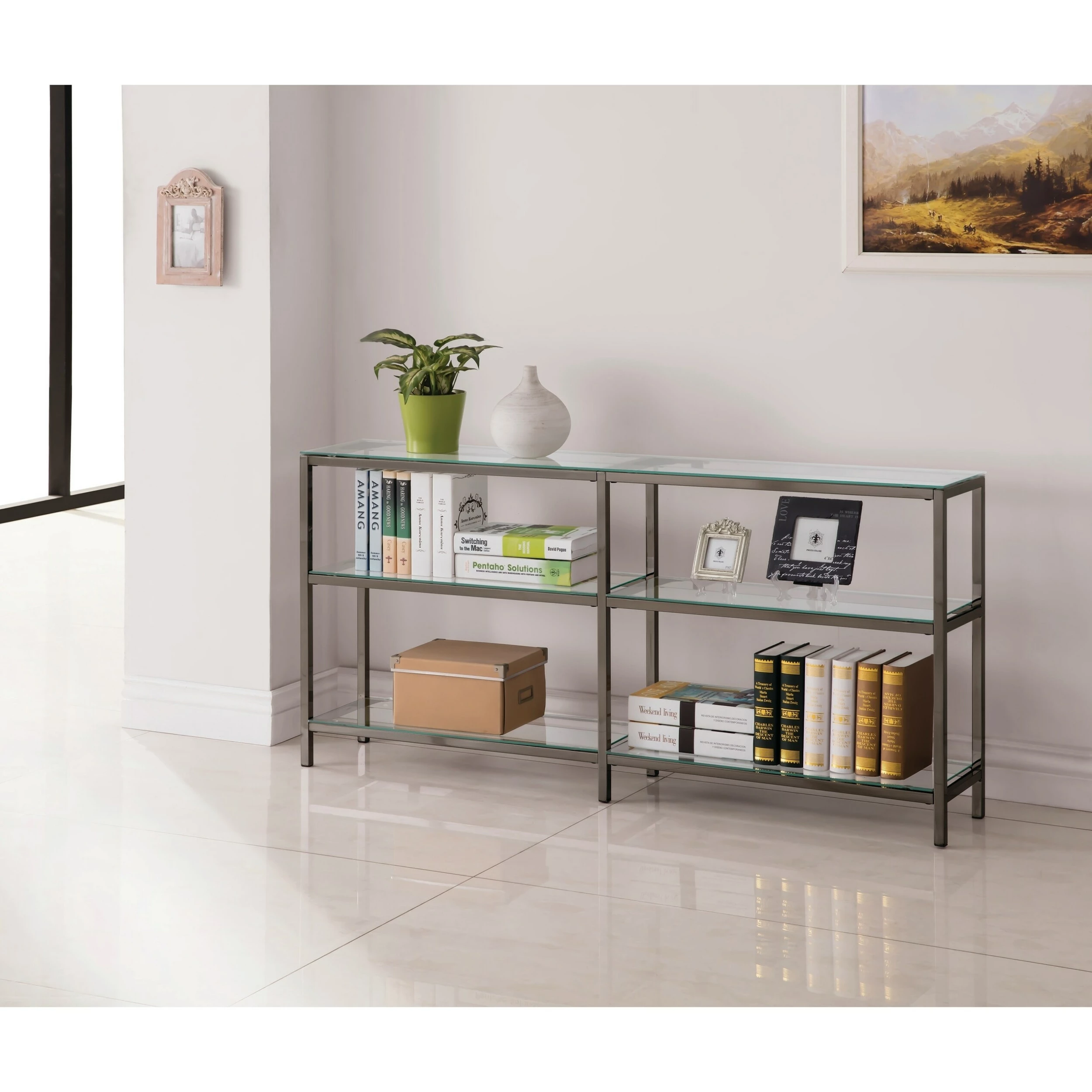 Show off a gorgeous art piece across the top of this delightful two-tier double bookcase. Demanding attention in a hallway or home office, the bookcase features a clean silhouette with black nickel finish framing and clear tempered glass shelves that create a beautiful display space for cherished mementos.