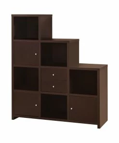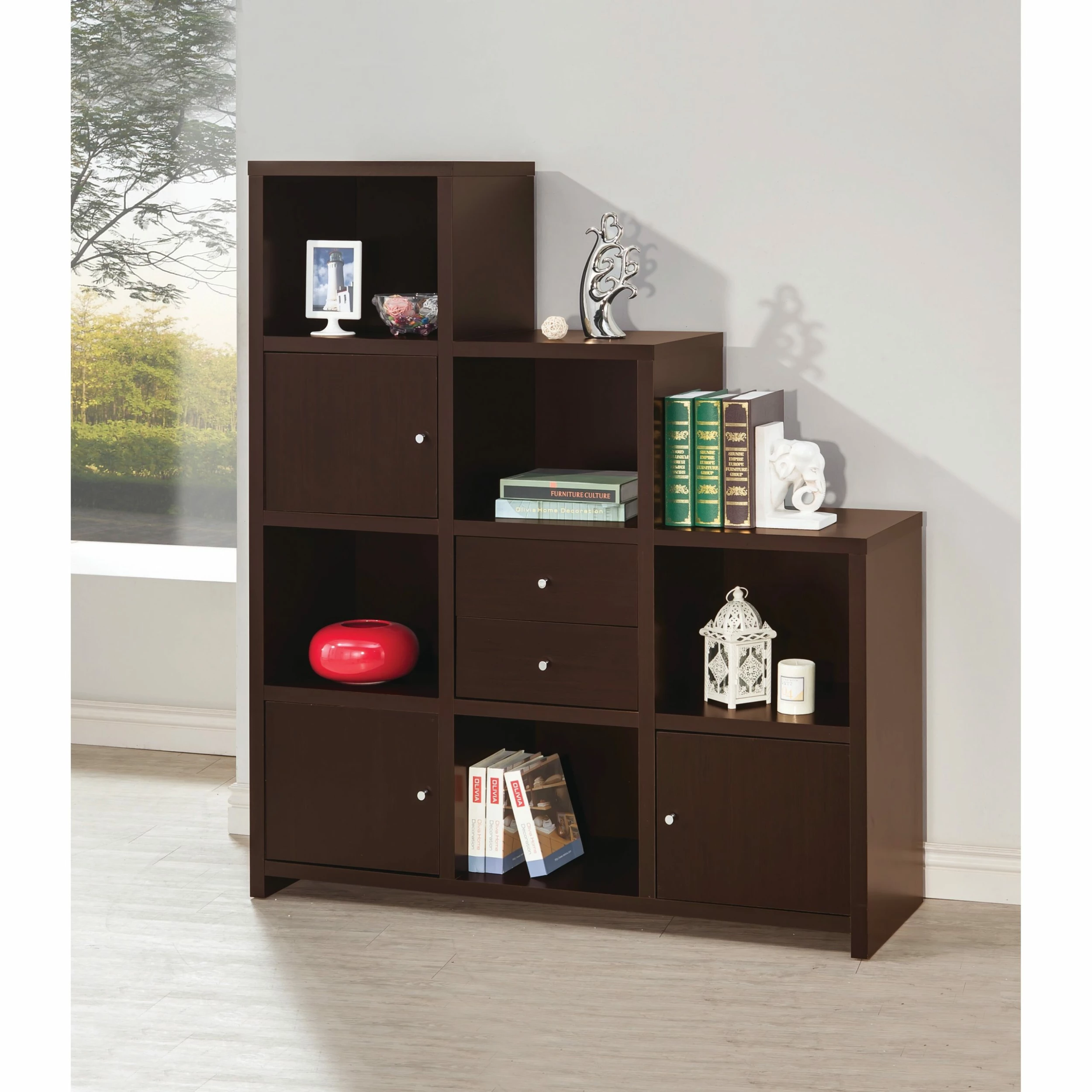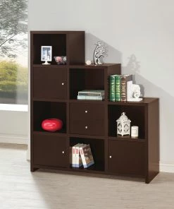 three cabinets and a set of drawers add ample organizational potential to this contemporary stair-step bookcase. IN a rich cappuccino finish, the bookcase is a beautiful addition to a spacious entry or living room delivering fantastic spaces for treasures and framed photos.
