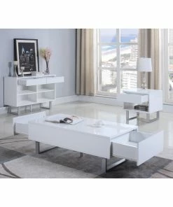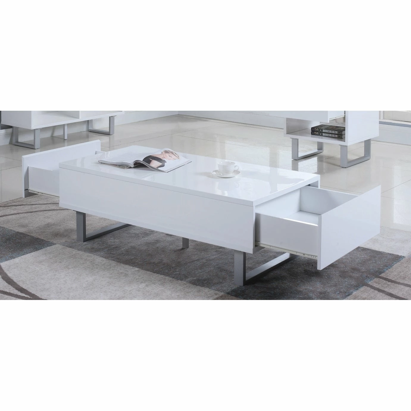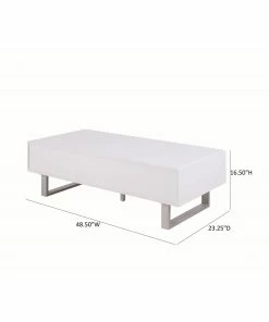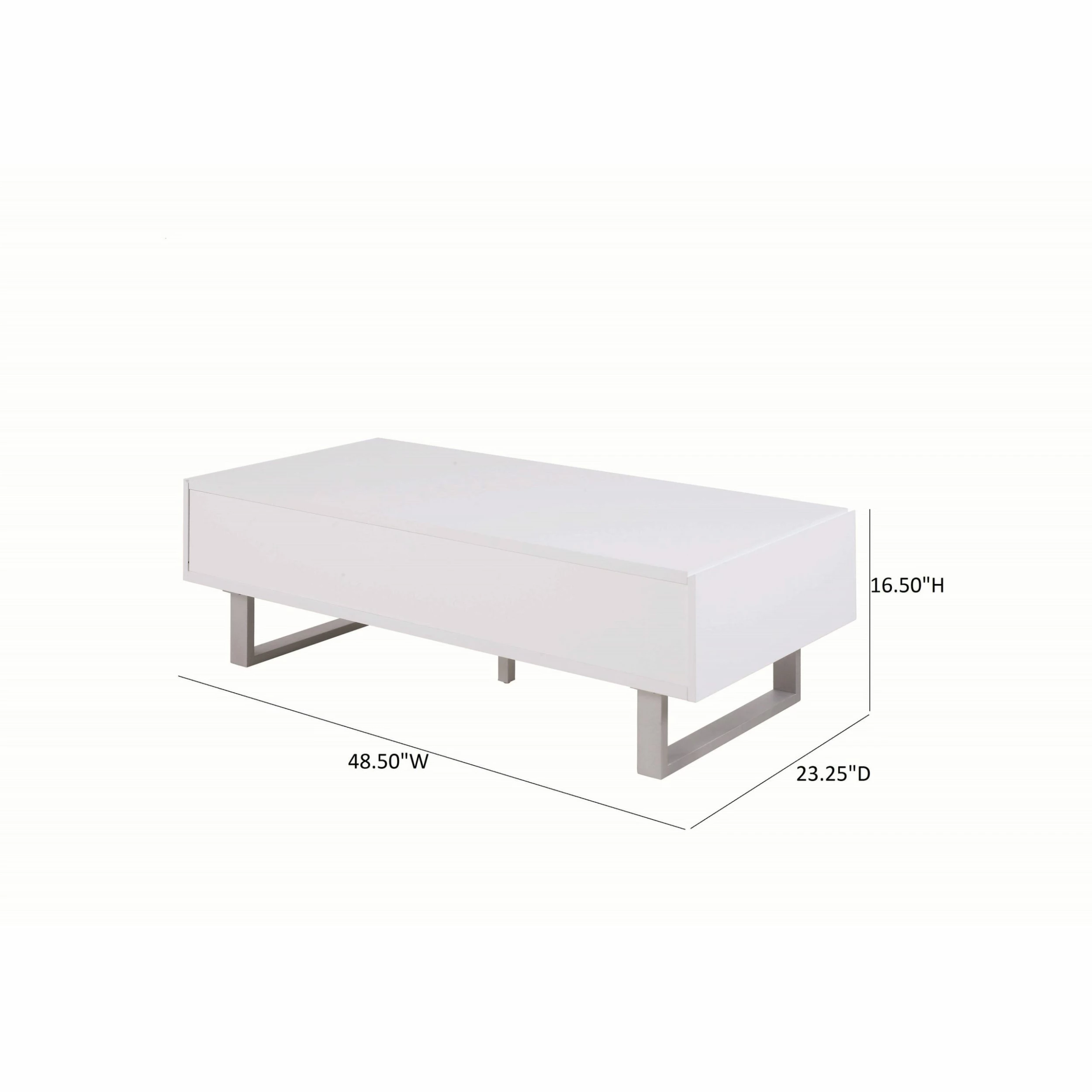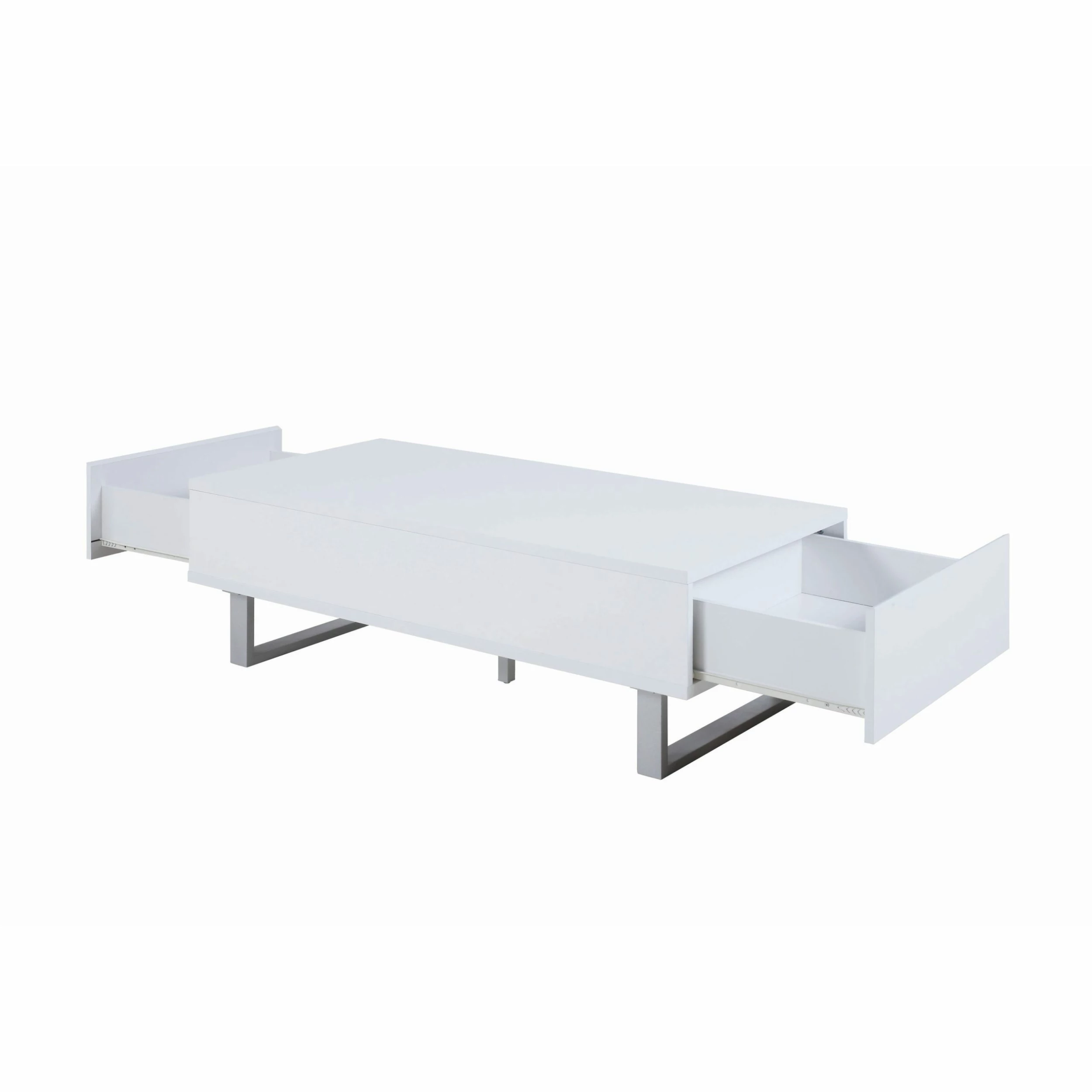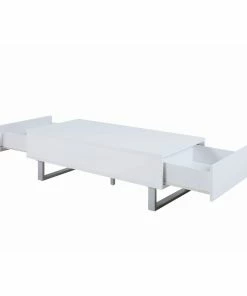 Take your room decor in a mid-century modern direction with this glossy white coffee table by Coaster. Open-frame brushed-nickel legs add boxy contemporary flair, while two discreet drawers extend from the sides for storing books, remote controls, school supplies, or electronics.
