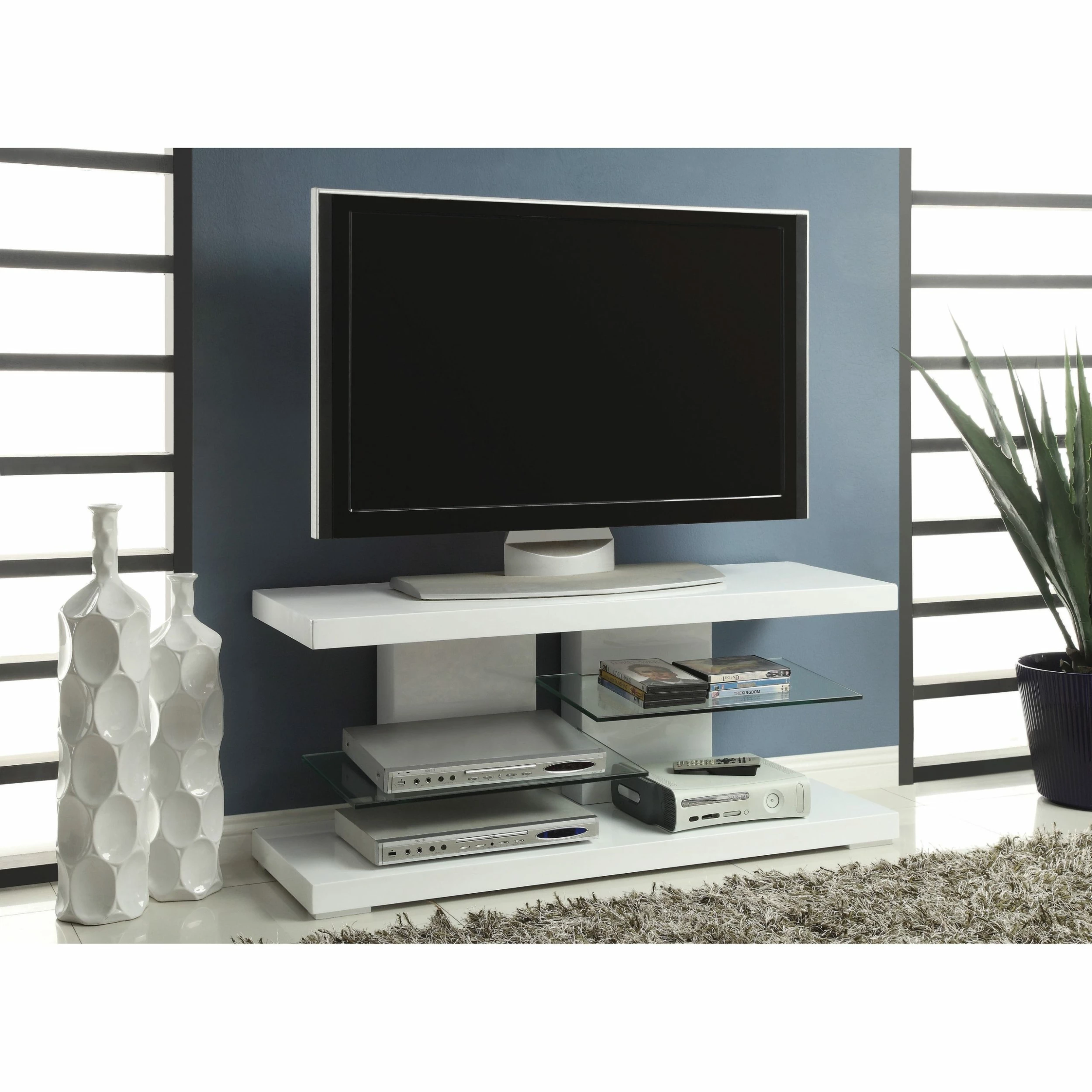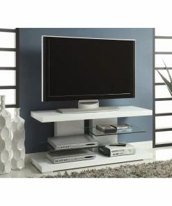 Ramp up the energy in an entertaining room with this contemporary TV console. Its glossy white finish captures attention, while a sturdy glass shelf on each side extend storage and display space.