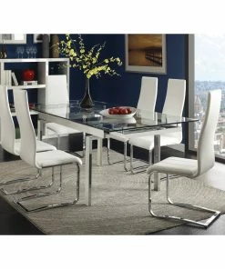 Upgrade a dining room with the modern curves in this contemporary dining chair. Open chrome legs support an armless white faux leather seat and clean, high back.