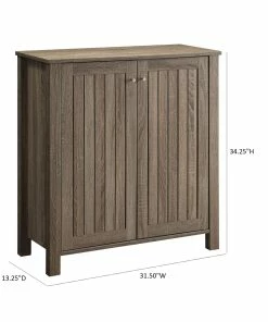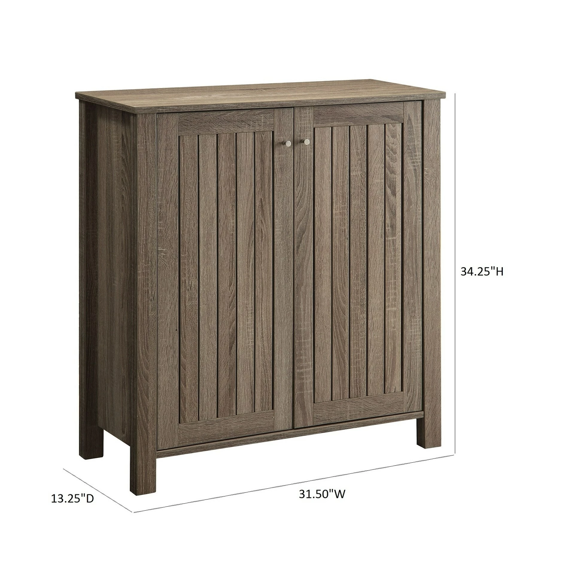 A traditionally outfitted entryway gains space and de-cluttering features with this country finish two-door shoe storage unit. Cabinet doors conceal three inner shelves that store boots and shoes between use, making this weathered grey finish wood cabinet a perfect choice.