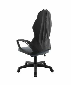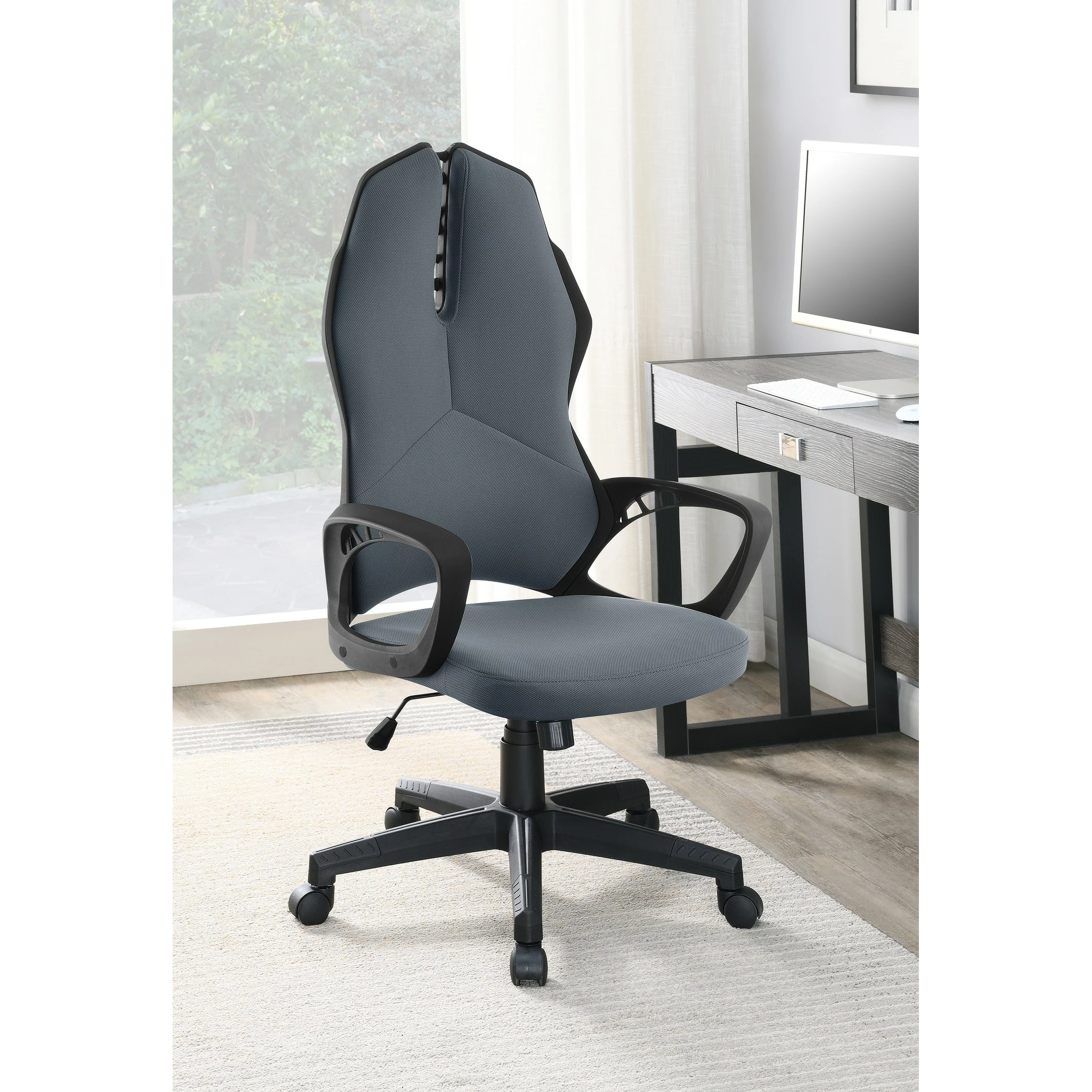 Ultra-modern with a dark grey fabric, this contemporary office chair features a unique backrest design. With a plushly padded backrest and seat, this office chair invites you to work in complete comfort. Its tall backrest also features a prong-like angular shape that conforms to your spine and hips, offering an ergonomic design. With black trim on the slim open arms and mobile wheeled base, this office chair projects a two-tone look that works with existing home office colors and decor styles. Conveniently roll around the office to retrieve paperwork or scoot it beneath the desk.