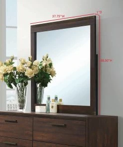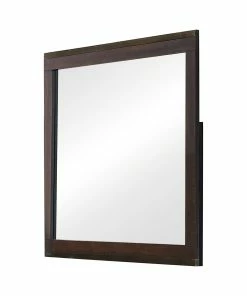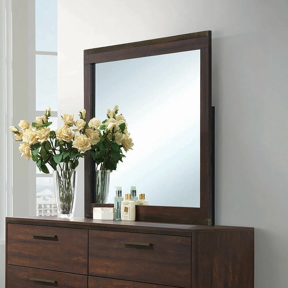 Enjoy the sturdy, classic look of this square wood dresser mirror. Perched atop a transitional dresser, its thick border of dark, smooth wood and a dual finish of rustic tobacco and dark bronze lend an elegance to any room.