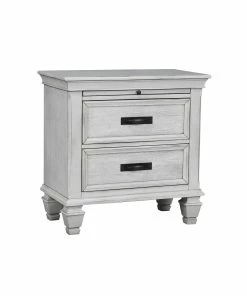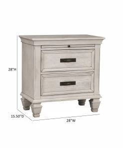 Update a bedroom with the farmhouse chic design of this two-drawer nightstand in an antique white finish. Complete with a pull-out tray for your bedtime tea and cord access holes, country charm marries with functional versatility.