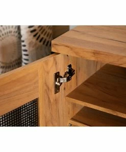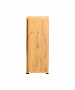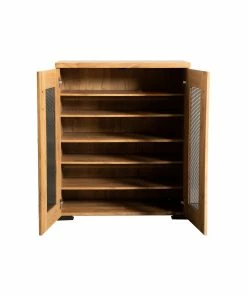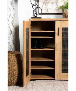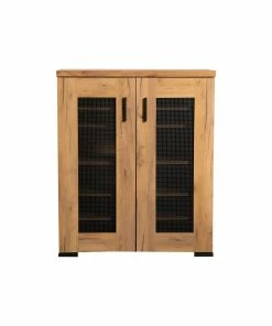 Organize your shoe collection inside this two-door rustic style shoe cabinet. The golden oak finish creates an attractive appeal in entryways and mudrooms. The gunmetal mesh door panels make for a striking contrast. Sleek bar pulls match the block style feet. Use this piece for your shoes or general storage needs.