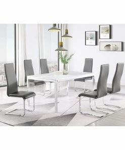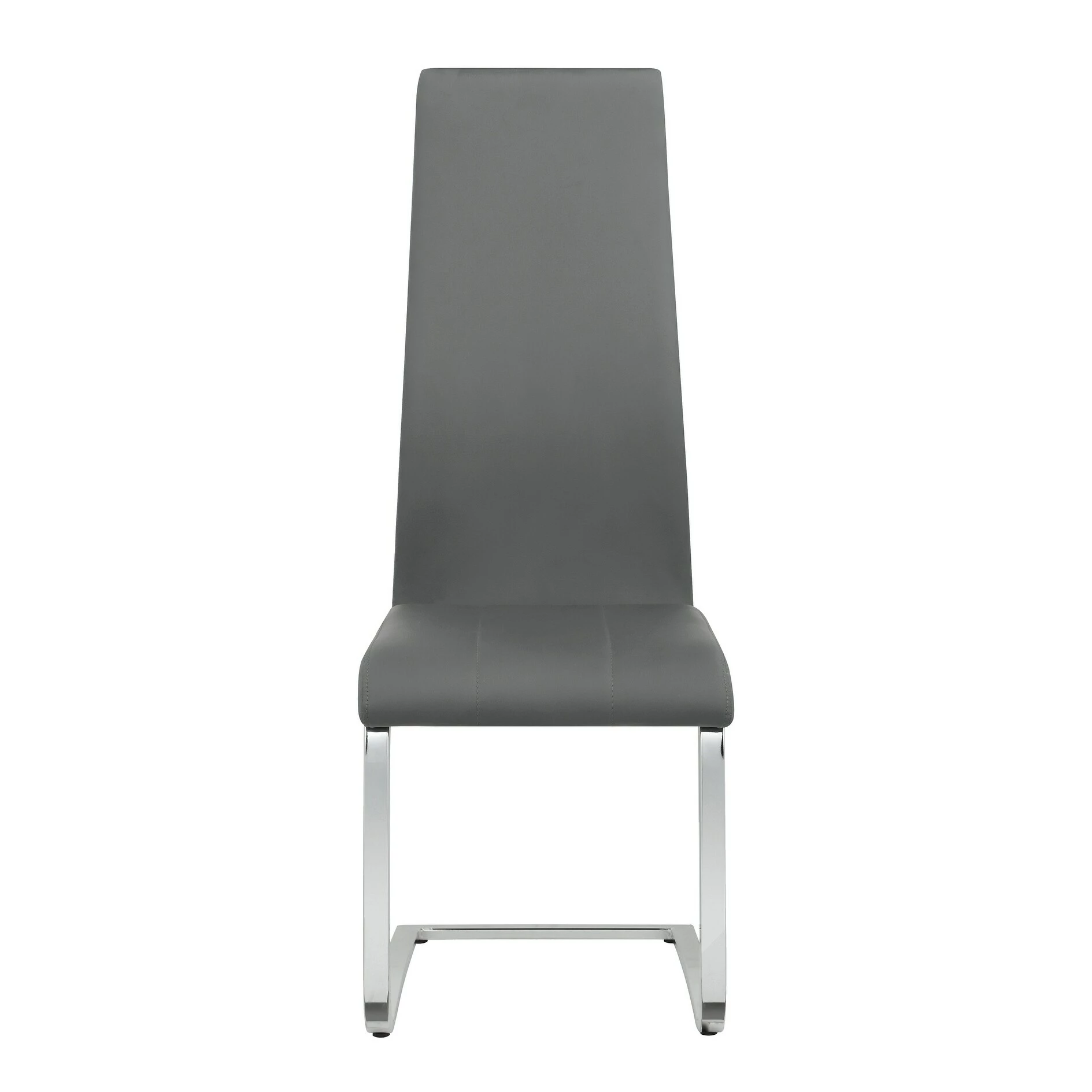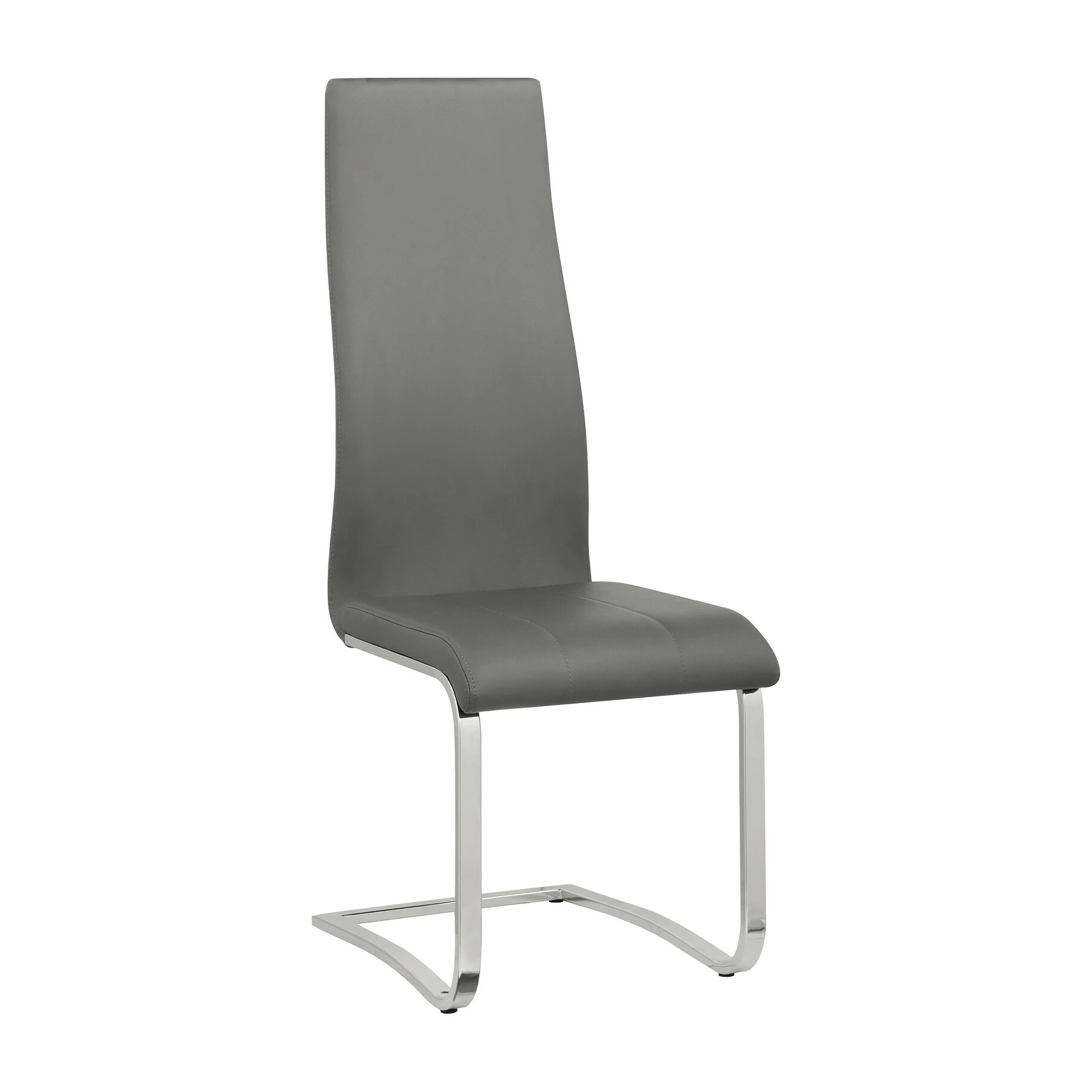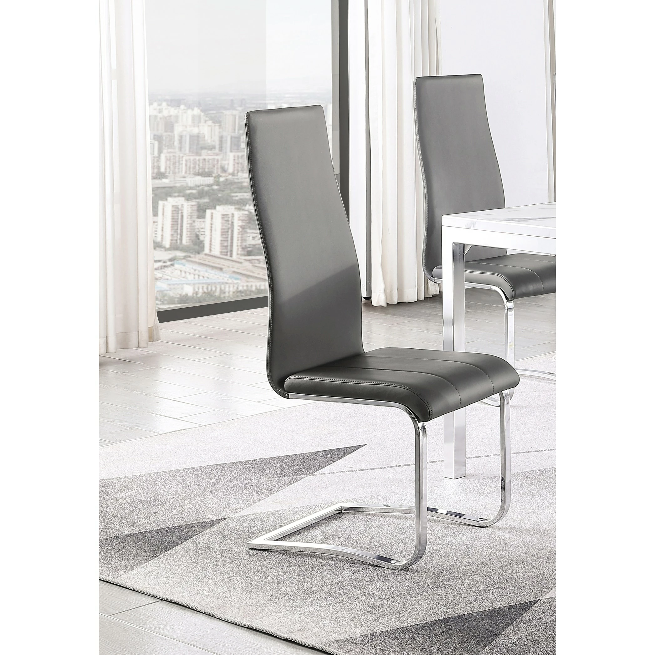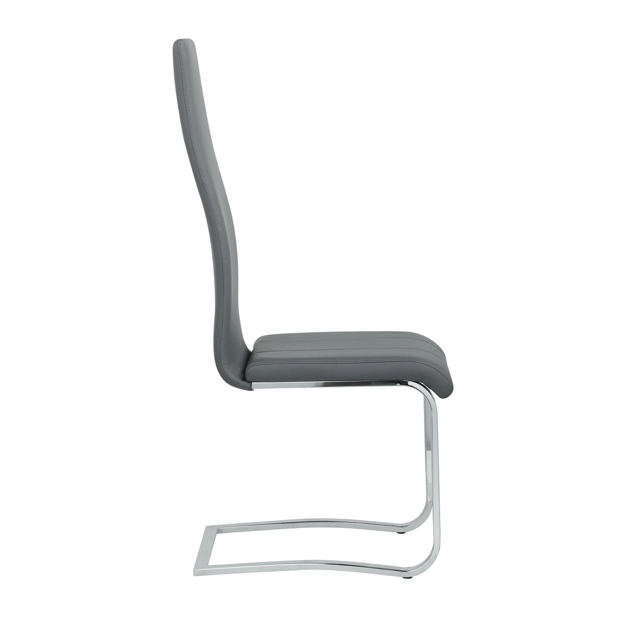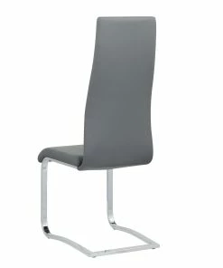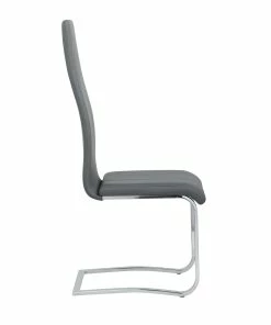 This set of four side chairs add a modern touch to a contemporary dining space. Each contemporary dining chair features an elongated backrest that is reminiscent of the iconic Breuer design, further lending to its modern flair. Invite guests over for a long evening of dinner and drinks, knowing they are comfortable and supported by an ergonomic curved backrest wrapped in a foam-filled grey leatherette. A padded seat features a waterfall front edge that falls elegantly into a U-shaped chrome finish frame and leg supports. In addition, this set of four chairs is available to suit your current color palette, offered in multiple colors to suit your tastes.