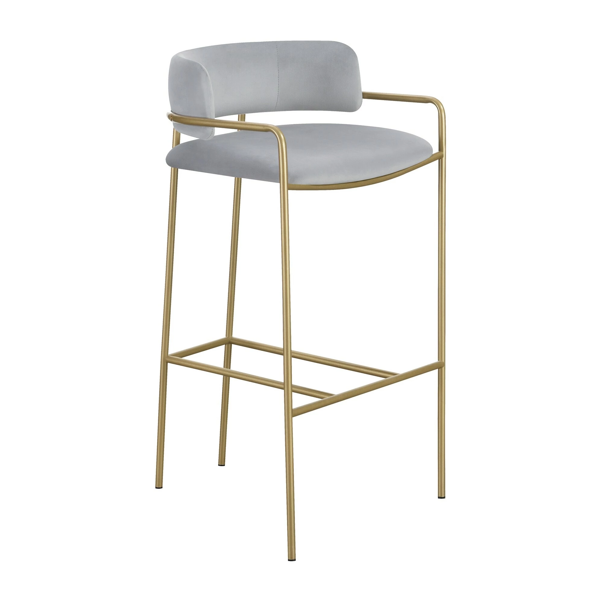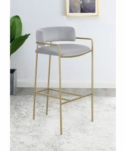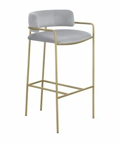 A soft and supple grey velvet envelops the comfy padded seat and linear backrest of this chic and glamorous stool. Situated and supported by a slim rod-like frame in a gold finish, this stool offers an air of sophistication to any bar top or kitchen island. The cool grey upholstery and warm metallic finish contrast, leaving a striking visual to any space. With a retro flair and glam vibe, this elegant stool is perfectly suited for a mid-century style home or contemporary entertainment room. Slide up this stool and relax with a cocktail or glass of wine.
