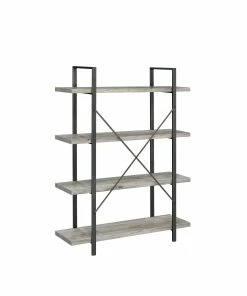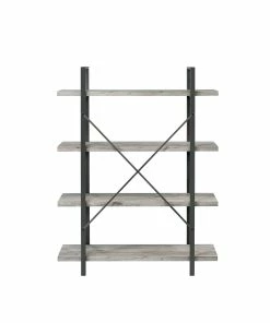This perfectly rustic style bookcase will soon improve your living area or workspace. Four spacious shelves provide plenty of storage for your book collection. The durable geometric frame provides an open and airy display. The cross back design provides additional support and aesthetic flair. This four-shelf bookcase is constructed from materials such as steel and engineered veneer.
