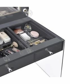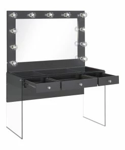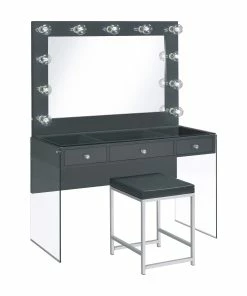 Add a bold, dramatic touch with this modern vanity set. Complete with a smooth, grey high gloss lacquer finish across the tabletop and mirror frame, this vanity matches a variety of color palettes. Supported by clear tempered glass side panels, the vanity appears to float in midair, leaving an open and airy flair. Continuing the glass feature is a clear tempered glass top that showcases accessories and cosmetics inside the three drawers. The oversized mirror also offers ample lighting with eleven retro-like globe shaped bulbs.