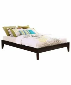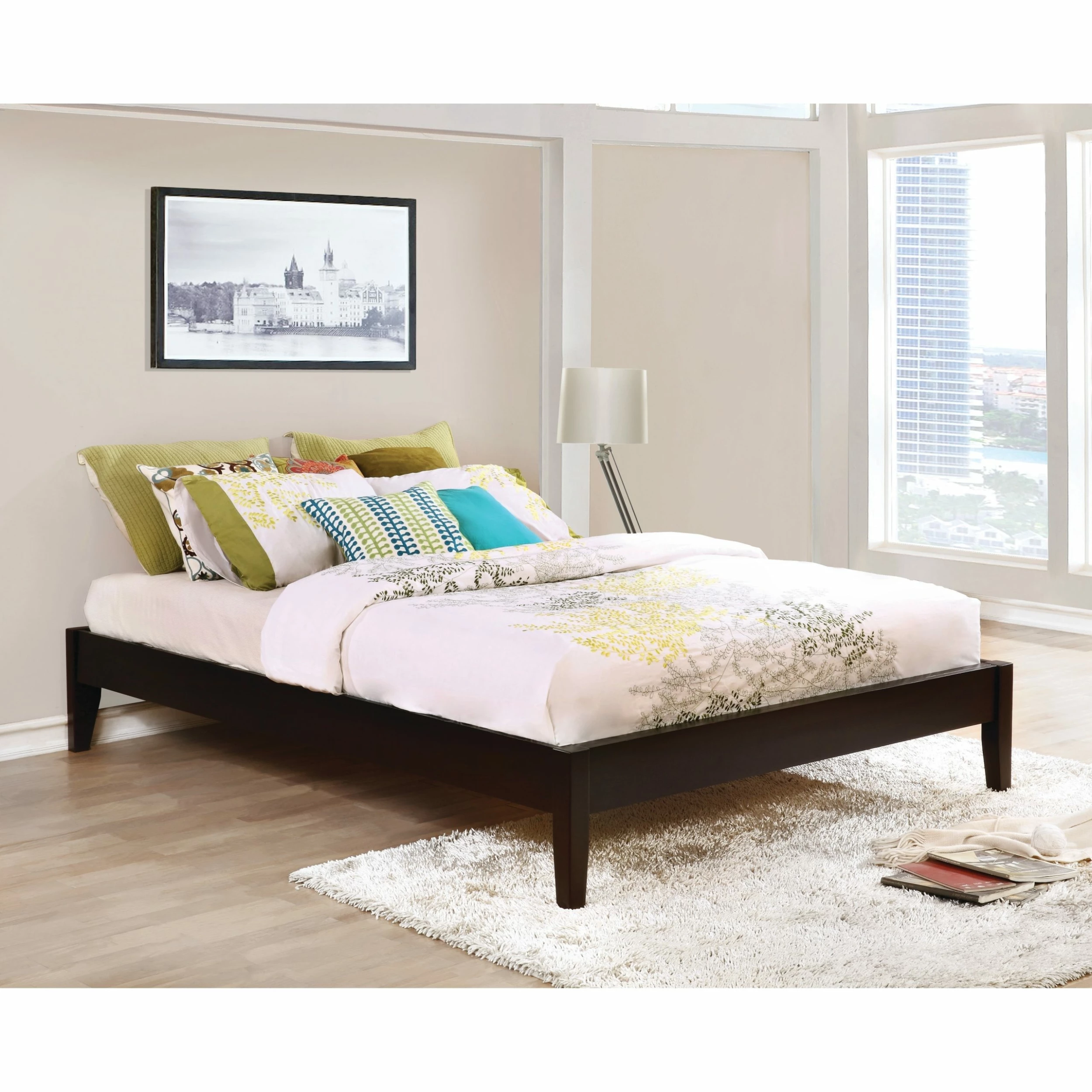 A classic platform silhouette in a rich cappuccino finish brings a modern minimalist aesthetic to this wood platform bed. Easily attaching to most headboards, the bed remains beautiful on its own, offering a crisp, refined look to a contemporary sleep space.