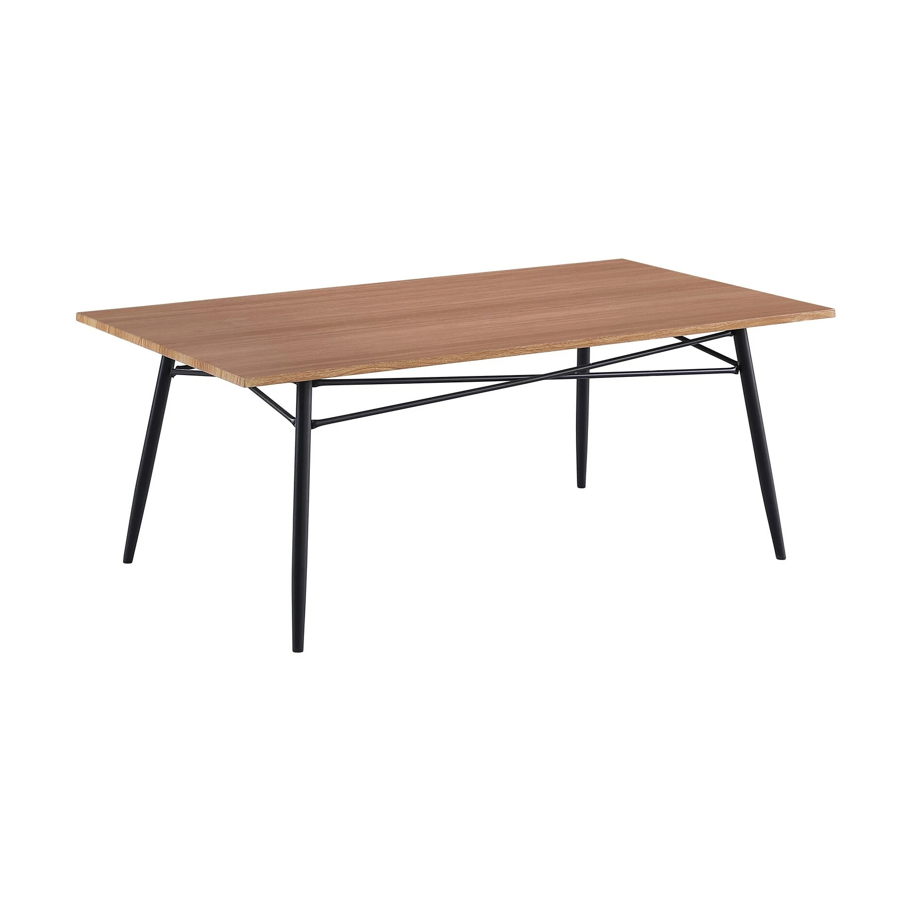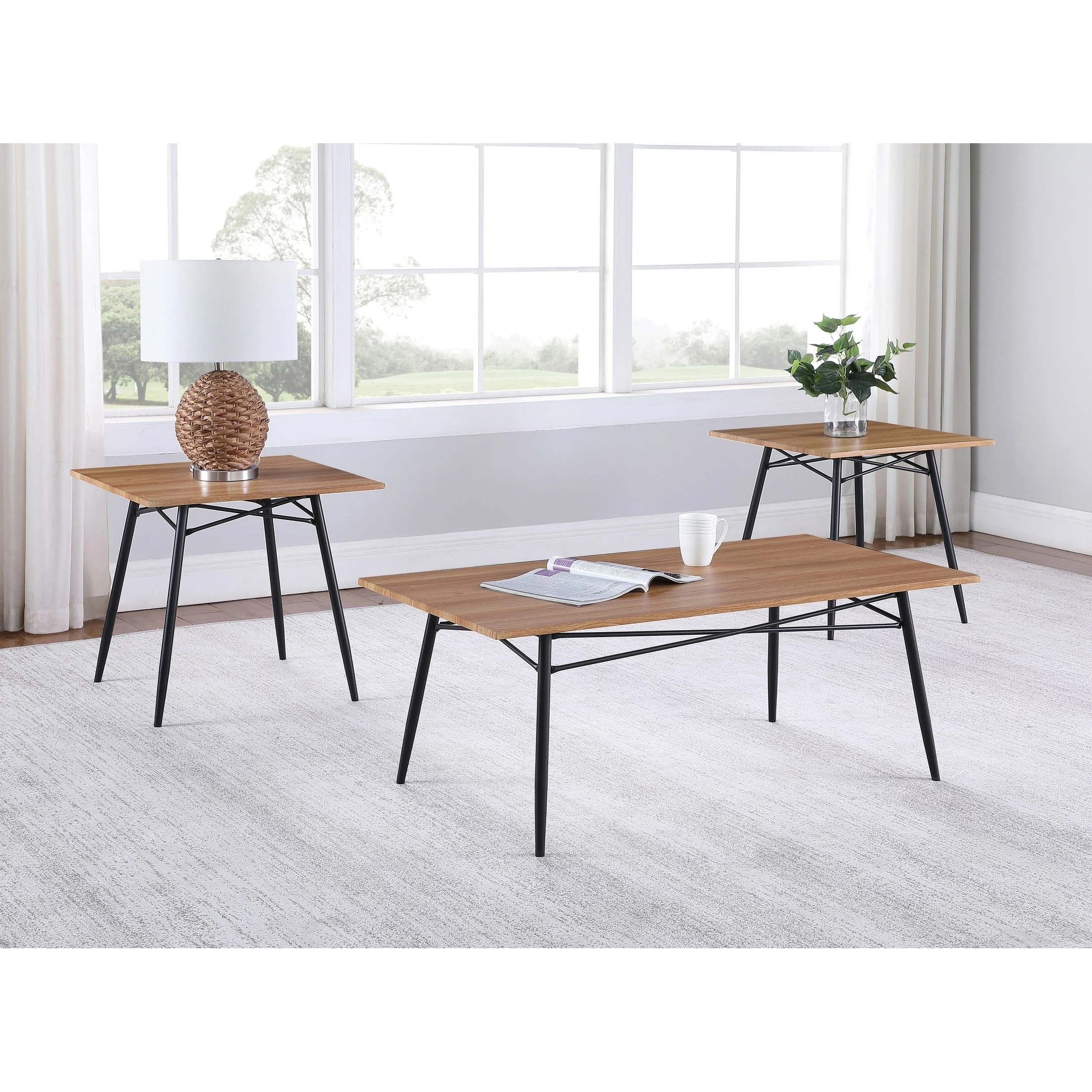 Complete your living space with a three-piece occasional set. Coming in a trio of a coffee table and two end tables, you’ll find all the space you need for table lamps and displaying decor. Each piece is finished in a versatile light brown finish. The black metal base is supported on tapered legs with intersecting details on the frame. Bring this occasional table set to your living area for a blend of modern and industrial.