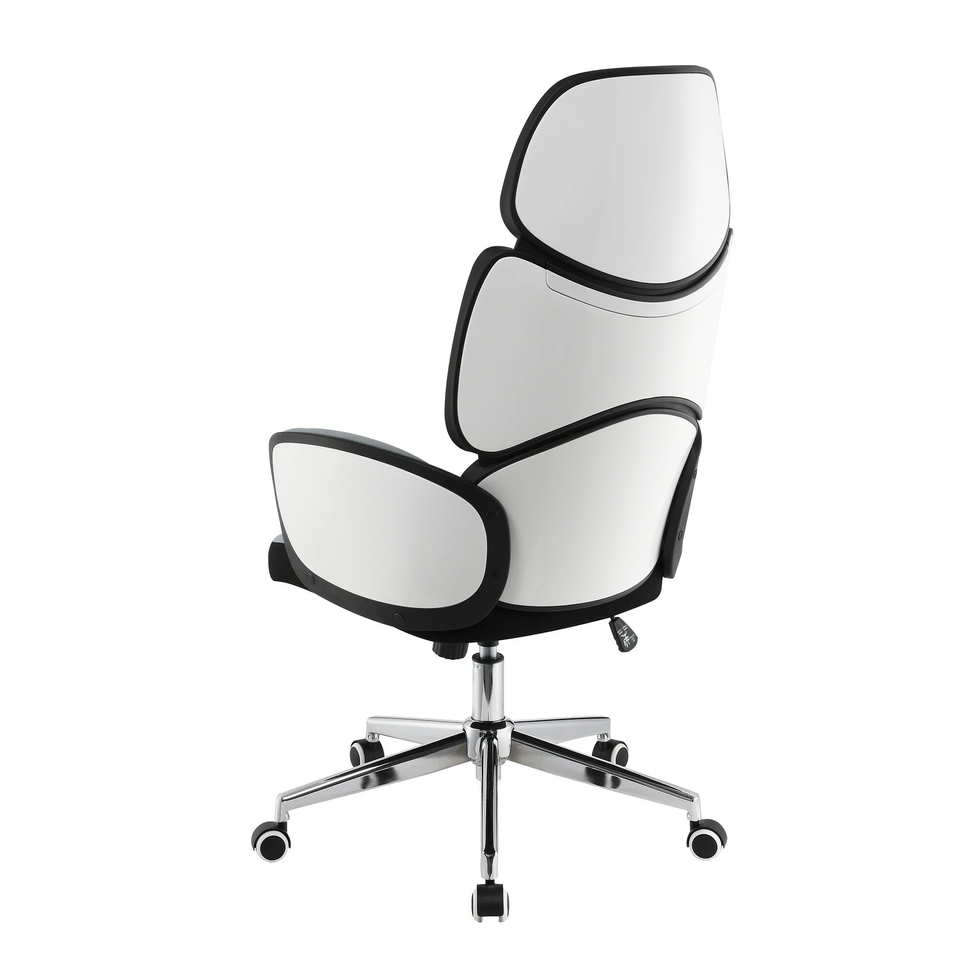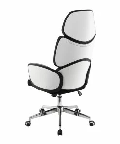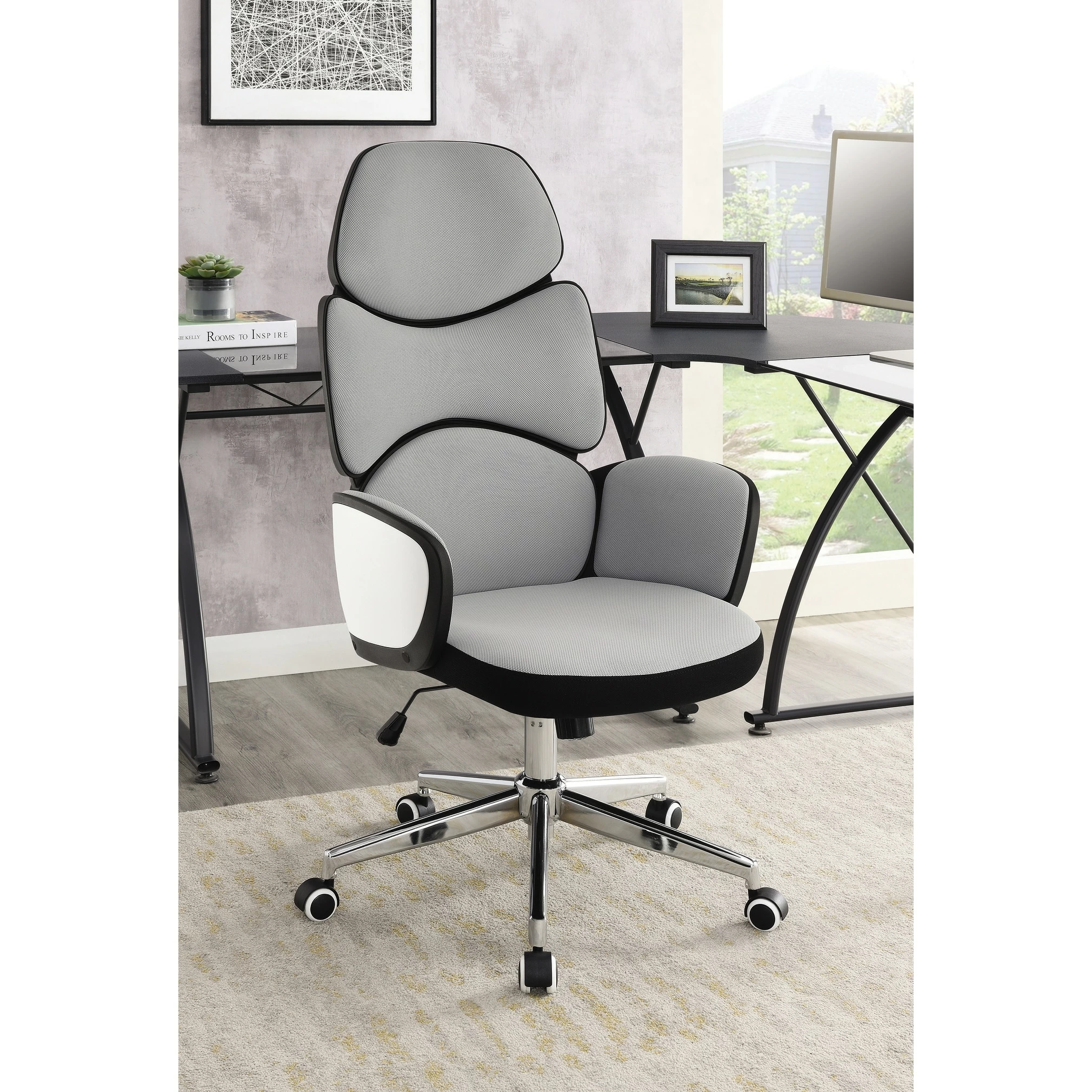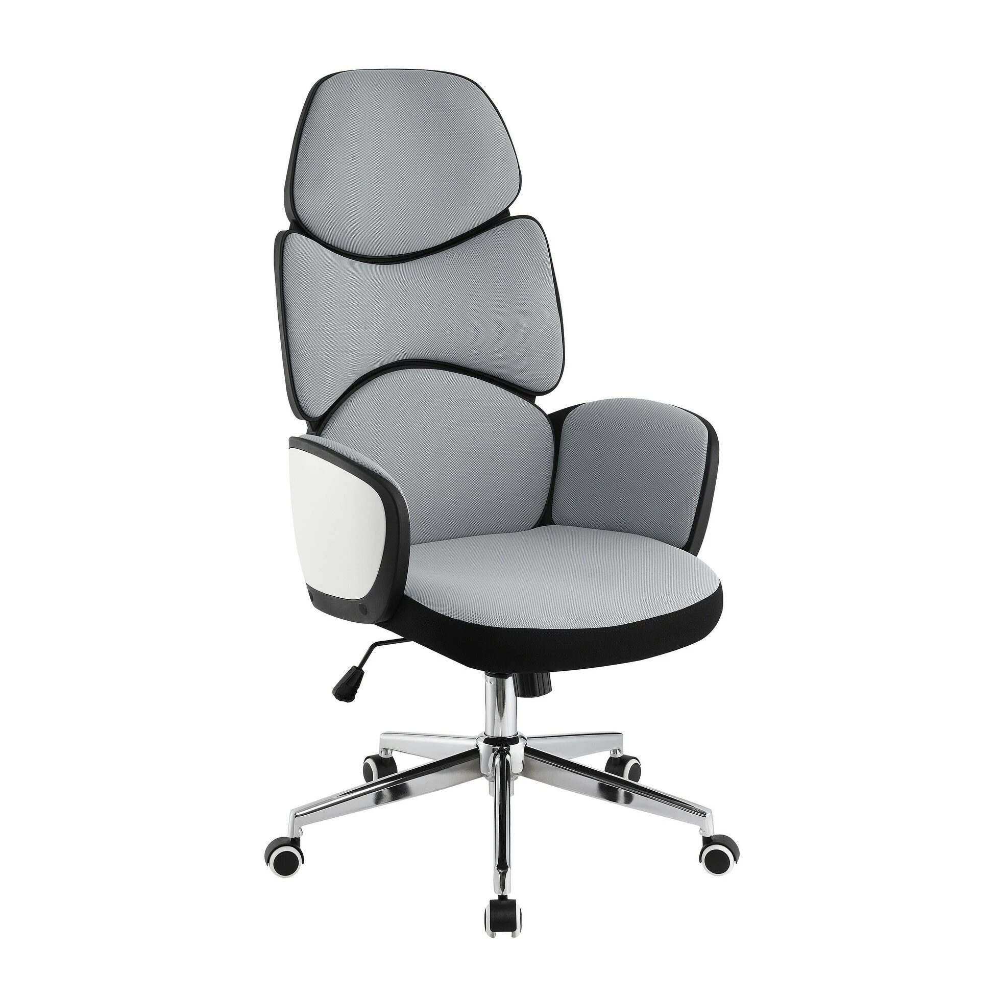 Rest comfortably at your desk with this contemporary office chair. Slim flared arms cradle the seat while a tall padded backrest offers long-lasting ergonomic support. Along the backrest are three separate pads, each one offering additional comfort along the spine, neck and shoulders. With a two-tone design, this stylish office chair is easy to match existing color palettes, with a soft light grey upholstery outlined in a black trim with a crisp white high gloss finish that adds a bold brightness on each arm exterior. In addition, this mobile office chair rests on a wheeled base in a polished chrome finish.