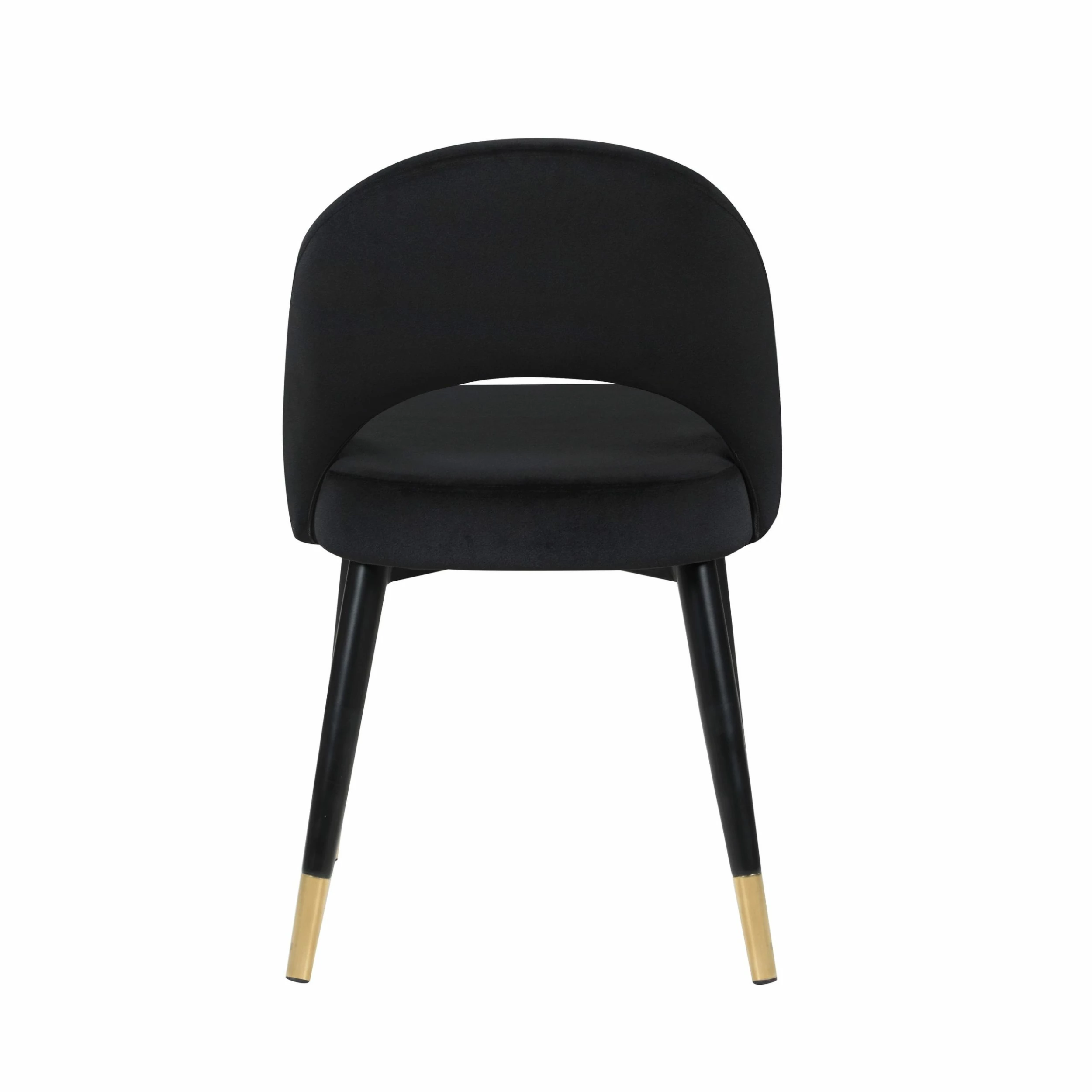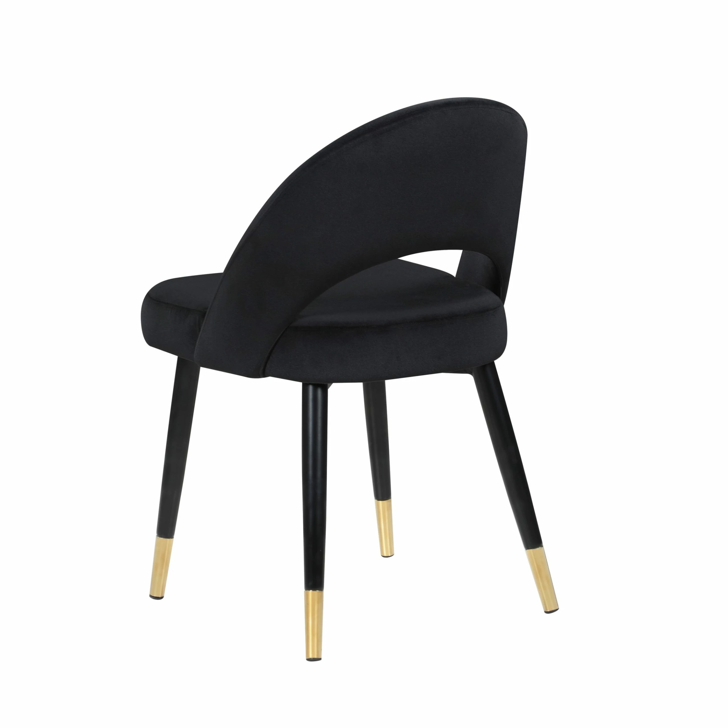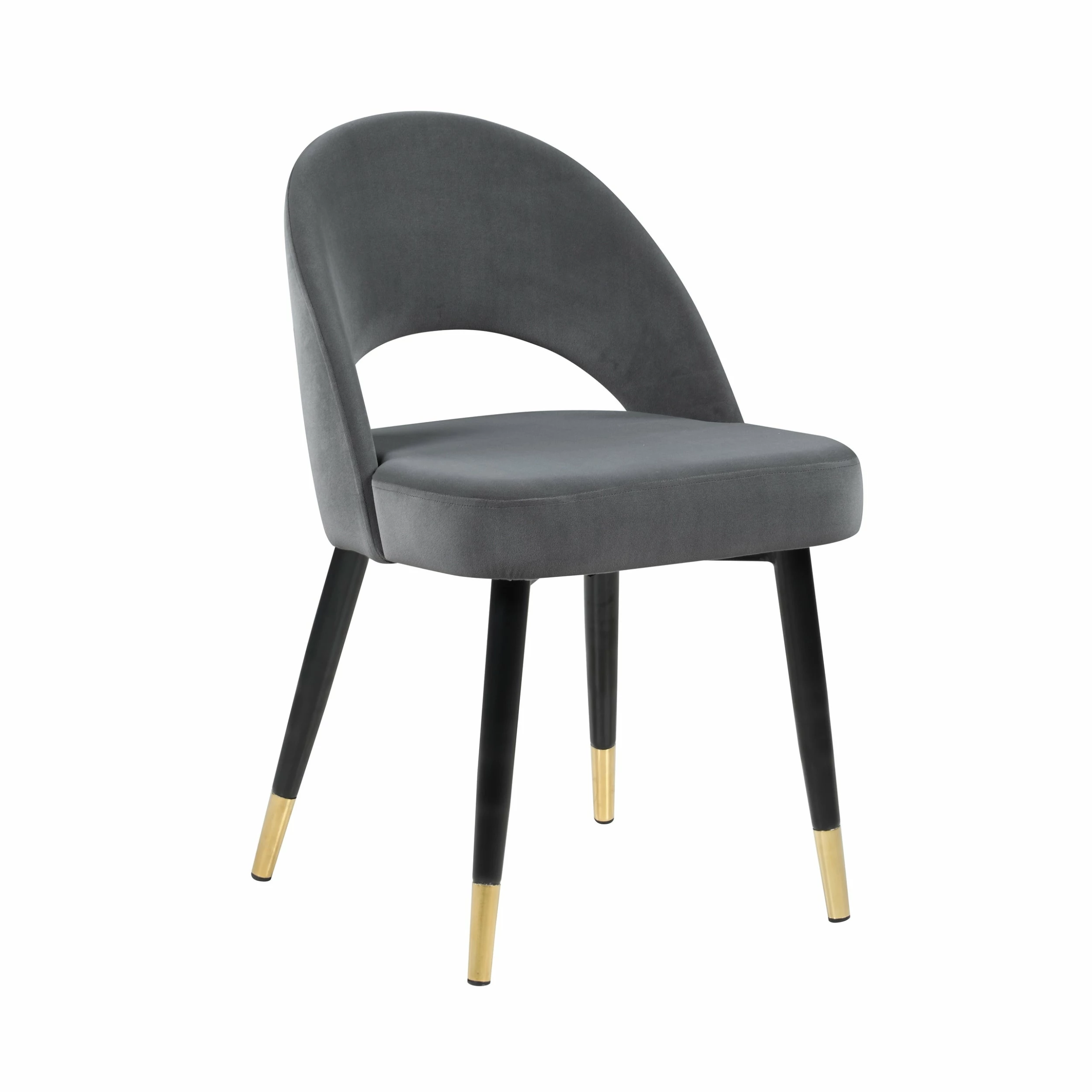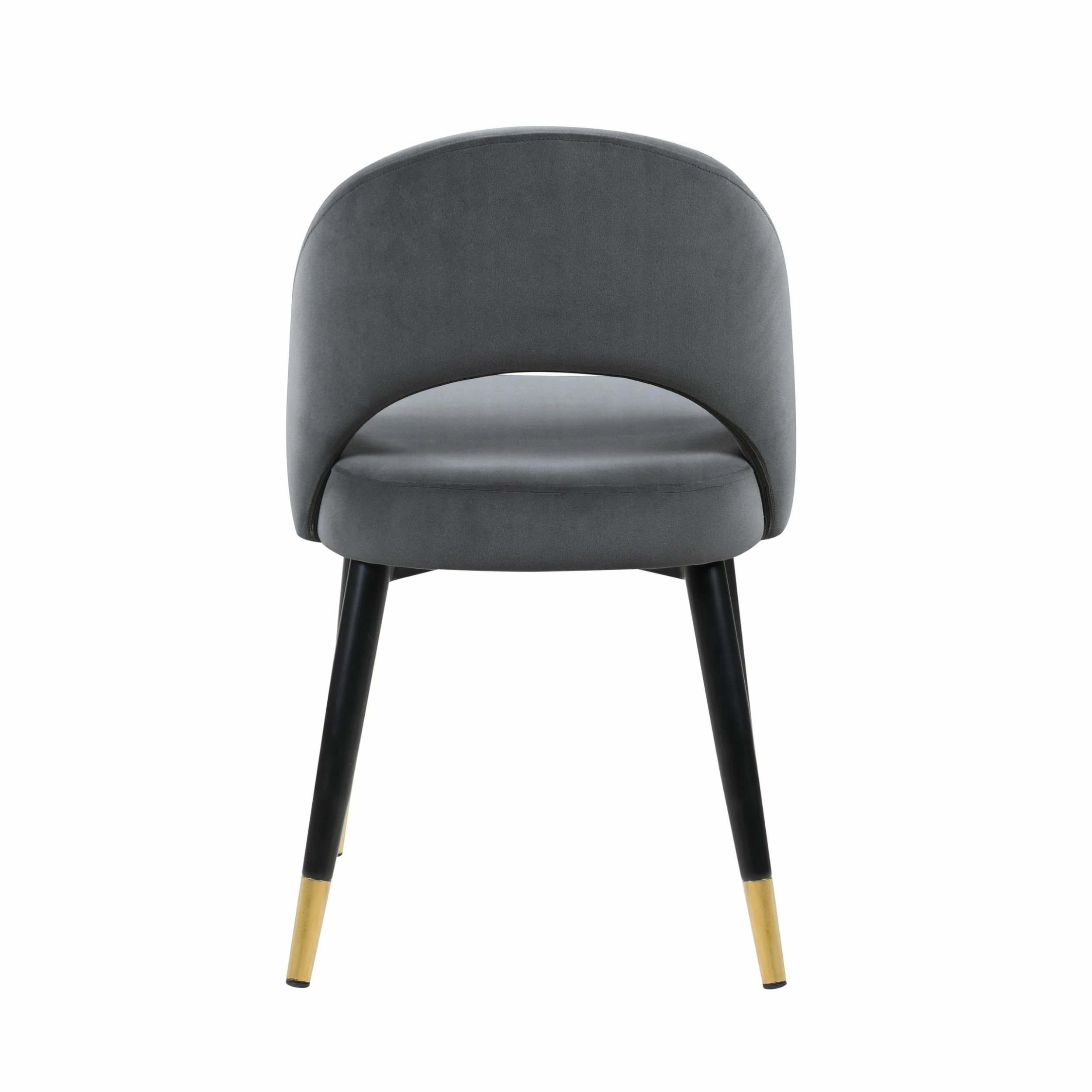 This set of two dining chairs features an elegant bucket style seat that lends a retro-inspired Mid Century modern look. Each chair offers long-lasting, supportive seats for each dinner guests, wrapped in 100% Polyester Velvet upholstery that complements numerous color palettes and adds a bold statement piece. Flared, tapered legs further lend to the vintage flair. Gold capped feet offers a dramatic, regal Hollywood glam touch. Pull these chairs up to a spacious rectangular dining table to host a formal dinner or cocktail night.