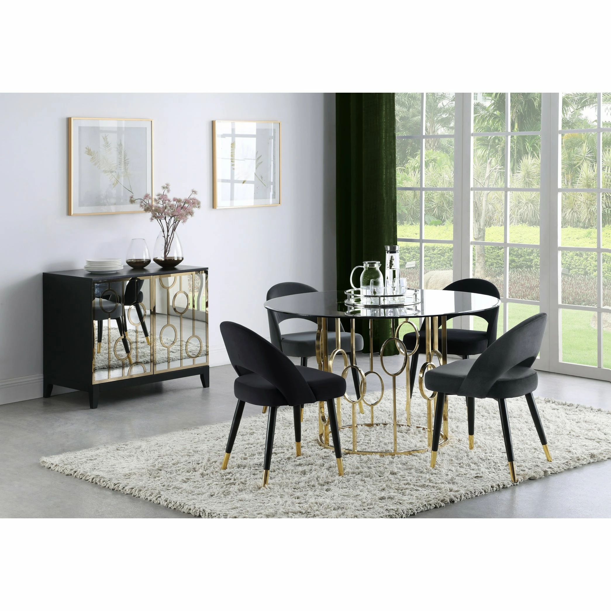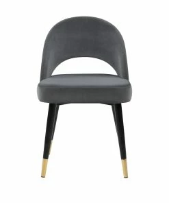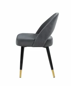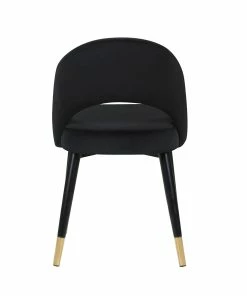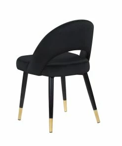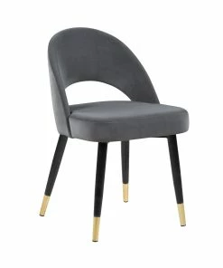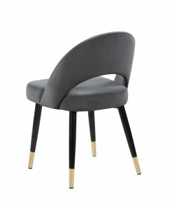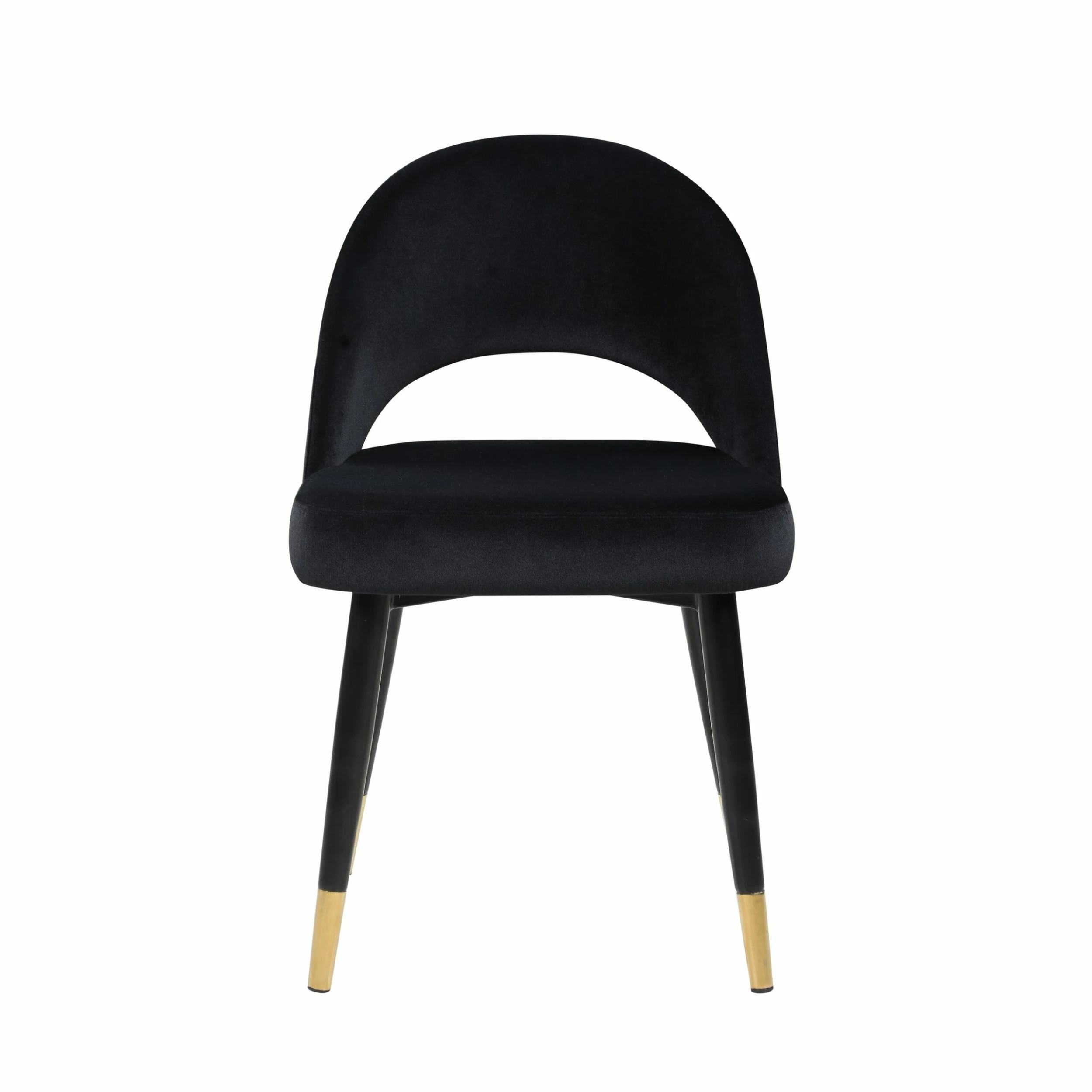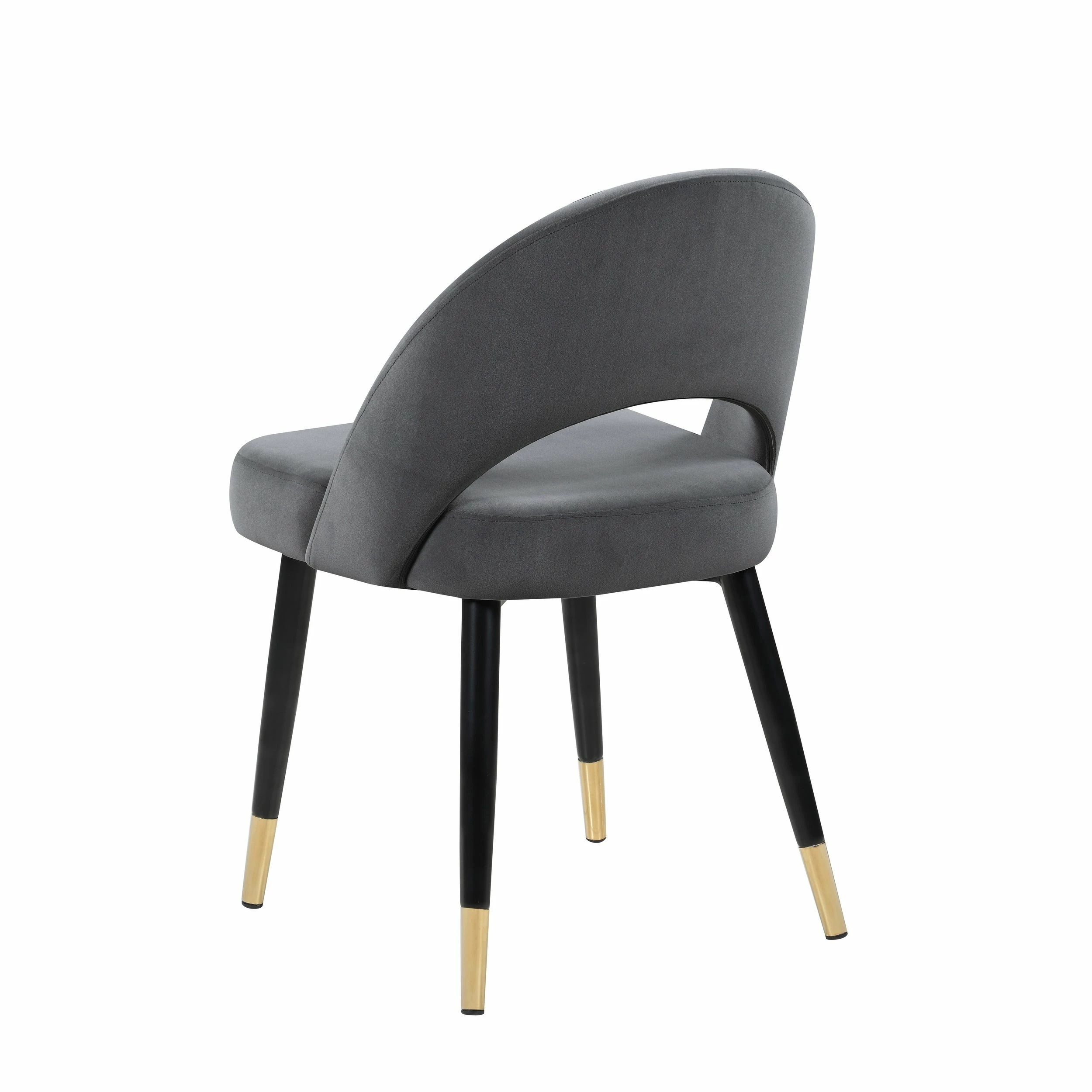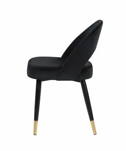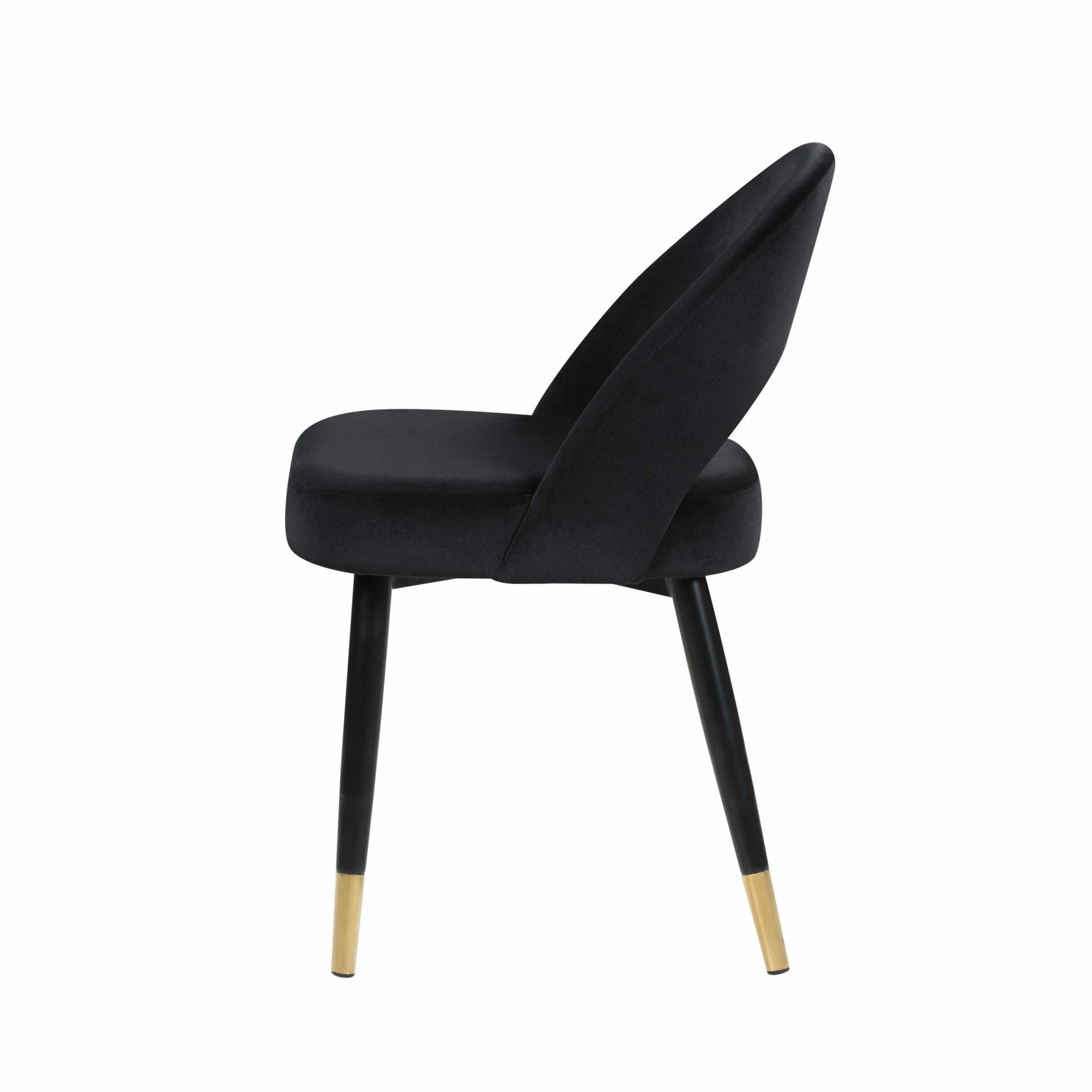 This set of two dining chairs features an elegant bucket style seat that lends a retro-inspired Mid Century modern look. Each chair offers long-lasting, supportive seats for each dinner guests, wrapped in 100% Polyester Velvet upholstery that complements numerous color palettes and adds a bold statement piece. Flared, tapered legs further lend to the vintage flair. Gold capped feet offers a dramatic, regal Hollywood glam touch. Pull these chairs up to a spacious rectangular dining table to host a formal dinner or cocktail night.