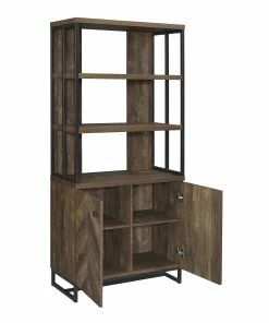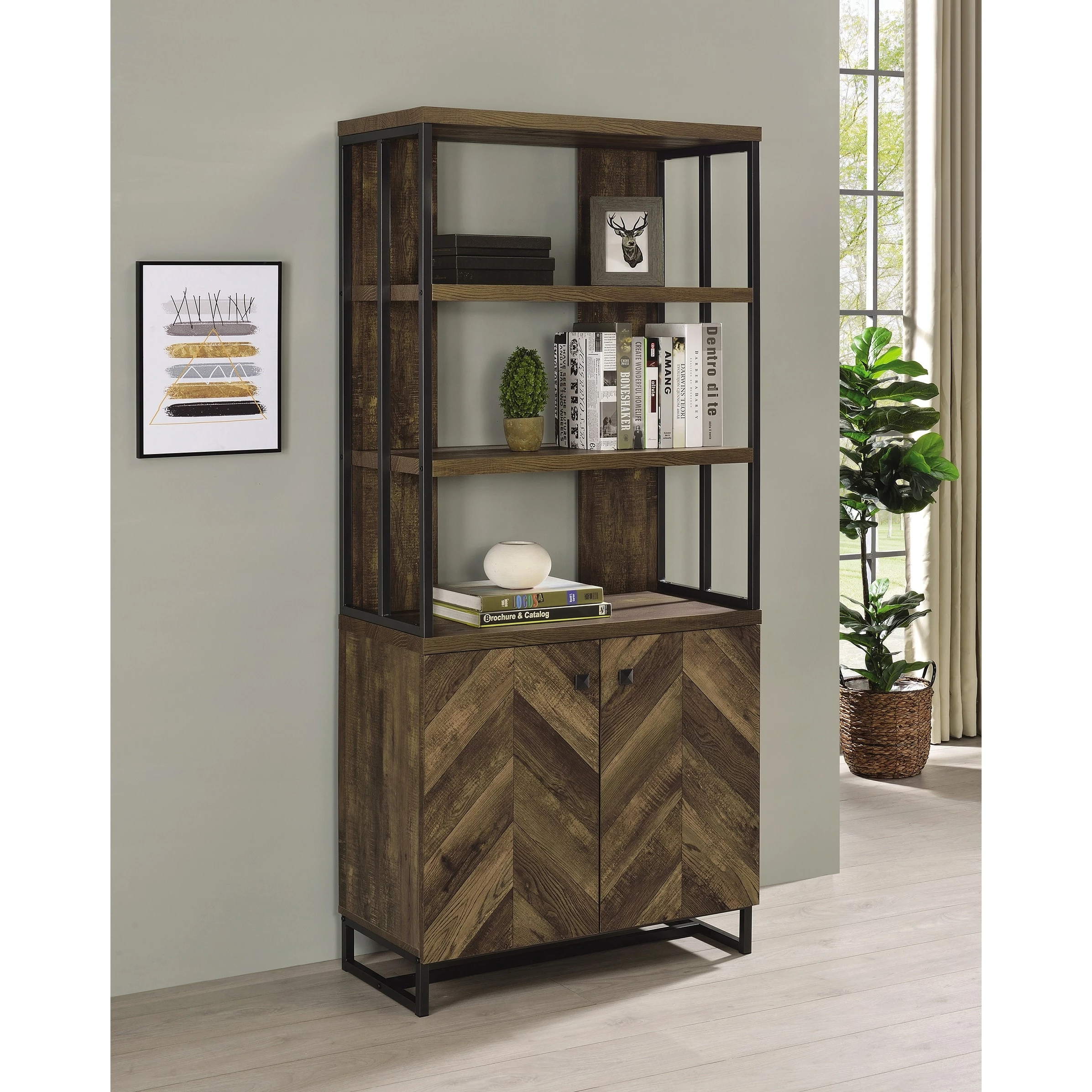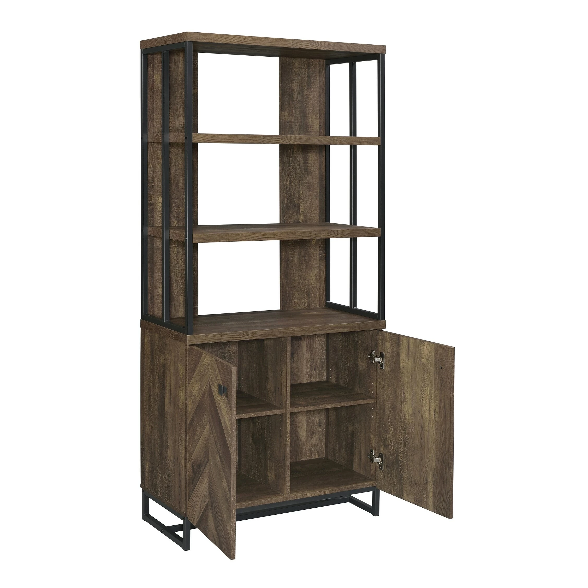 Compact and vertical, this bookcase is perfect for storing your home library collection. Designed with a rustic oak finish and a diagonal-like herringbone pattern that catches the eye. Resting and accented by a slim and sturdy heavy gauge steel frame in a gunmetal powder coated finish, this rustic bookcase offers an industrial style flair to a home office or living room. In addition, it features three open shelves to display decor and more, along with a two-door cabinet with two adjustable shelves to tuck items out of sight. Incorporate this country-inspired bookcase in a modern farmhouse style home.