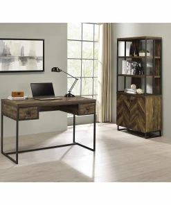 Place this writing desk in a rustic home office or library for a chic look. Designed with a rustic oak finish throughout and a herringbone pattern along the tabletop surface, this writing desk leaves a bold impression in any space. With a rectangle shape and sleek, thin metal frame and base, it offers a sturdy design and a minimal look. Two spacious drawers on Euro glides offer ample room for desk accessories and paperwork. The frame is also built of a heavy gauge steel frame that has a gunmetal finish powder coating.