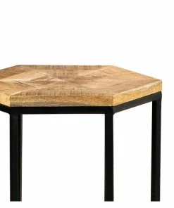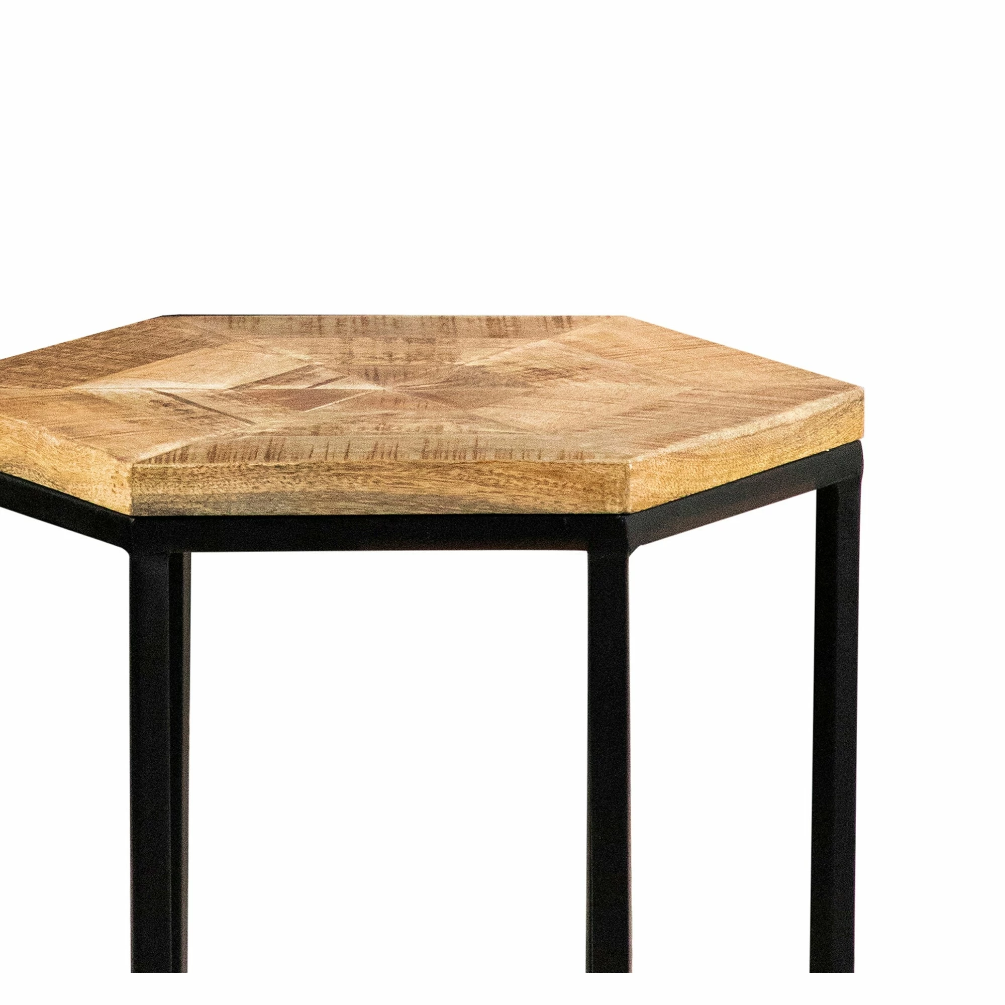 Go geometric with this set of two nesting tables. The wood hexagon tabletop makes its own display in your living area. Enhance the function of this piece by placing decor and small possessions on top. The matching black metal frame takes on the same hexagon shape with slim yet sturdy legs. The second nesting table brings extra space to display decor.