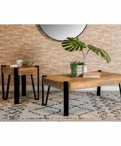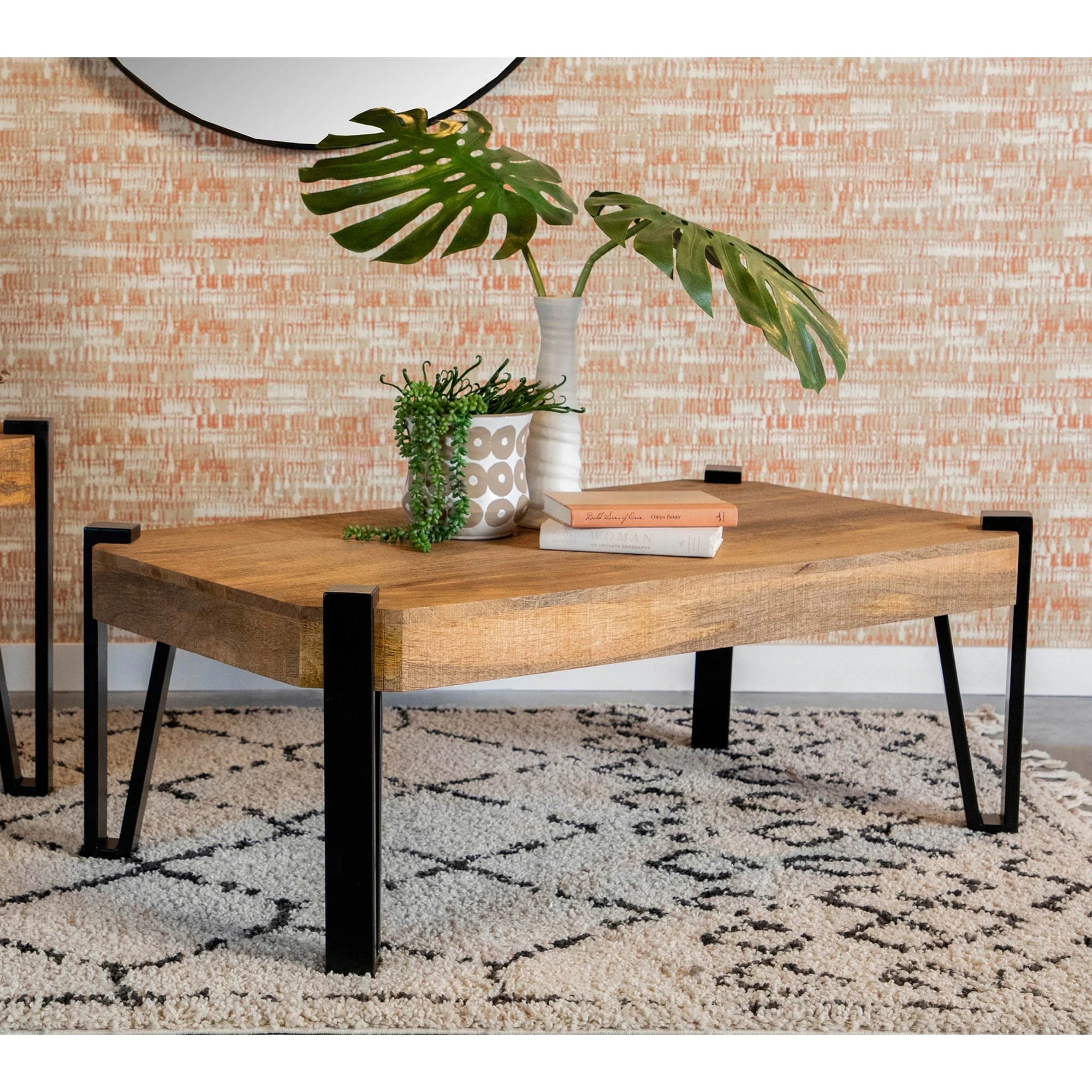 A solid wood mango tabletop offers a striking woodgrain and a natural layering of colors to this coffee table piece. On each corner, modern legs are attached and raised above the surface. This boho-chic coffee table also offers a striking mixed material design and each of the four legs offers a rustic hairpin-inspired shape and a contrasting matte black finish. In addition, each iron leg offers extra stability and support for whatever you choose to set on top. Place this coffee table within your living room seating ensemble for a unique look.