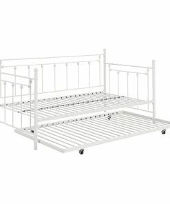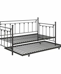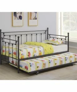 This twin size daybed offers a compact furniture piece for smaller bedrooms. Designed in a classic farmhouse style, it offers a charming classic spindle style with modern touches like a powder coated finish. Each spindle is adorned with a round metal finial accent, which adds a lovely traditional touch. Convenient and versatile, this twin daybed also comes with a rolling underbed trundle that can pulled out for overnight company and sleepovers. Smooth gliding casters make it super easy and this bed is available in two finishes so you can choose the color that best matches your existing color palette and style.