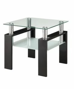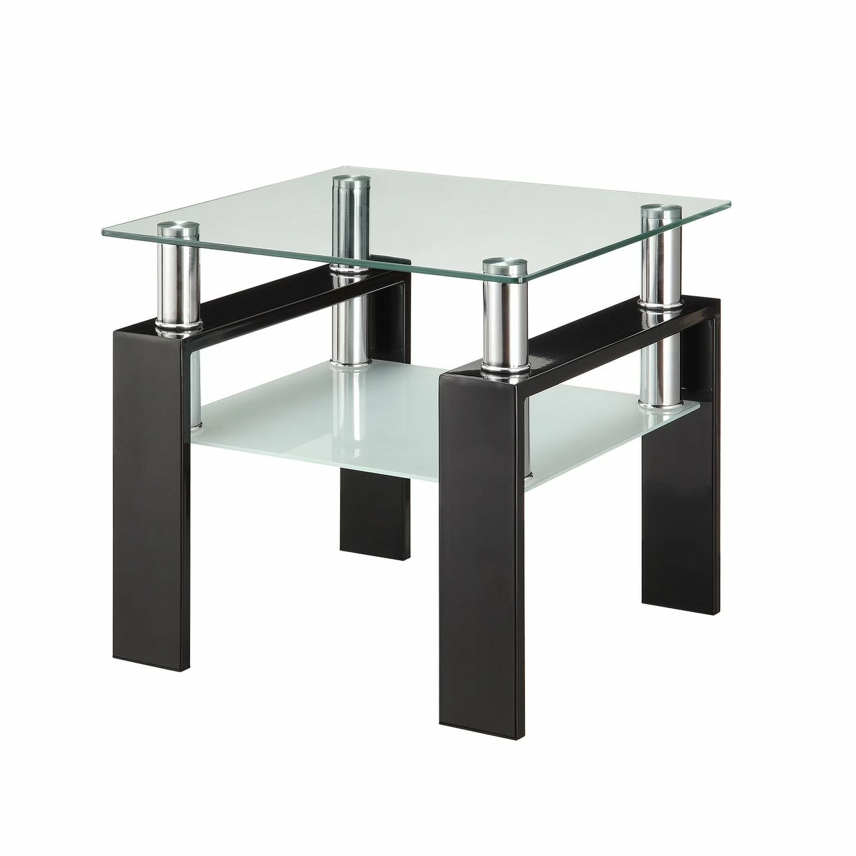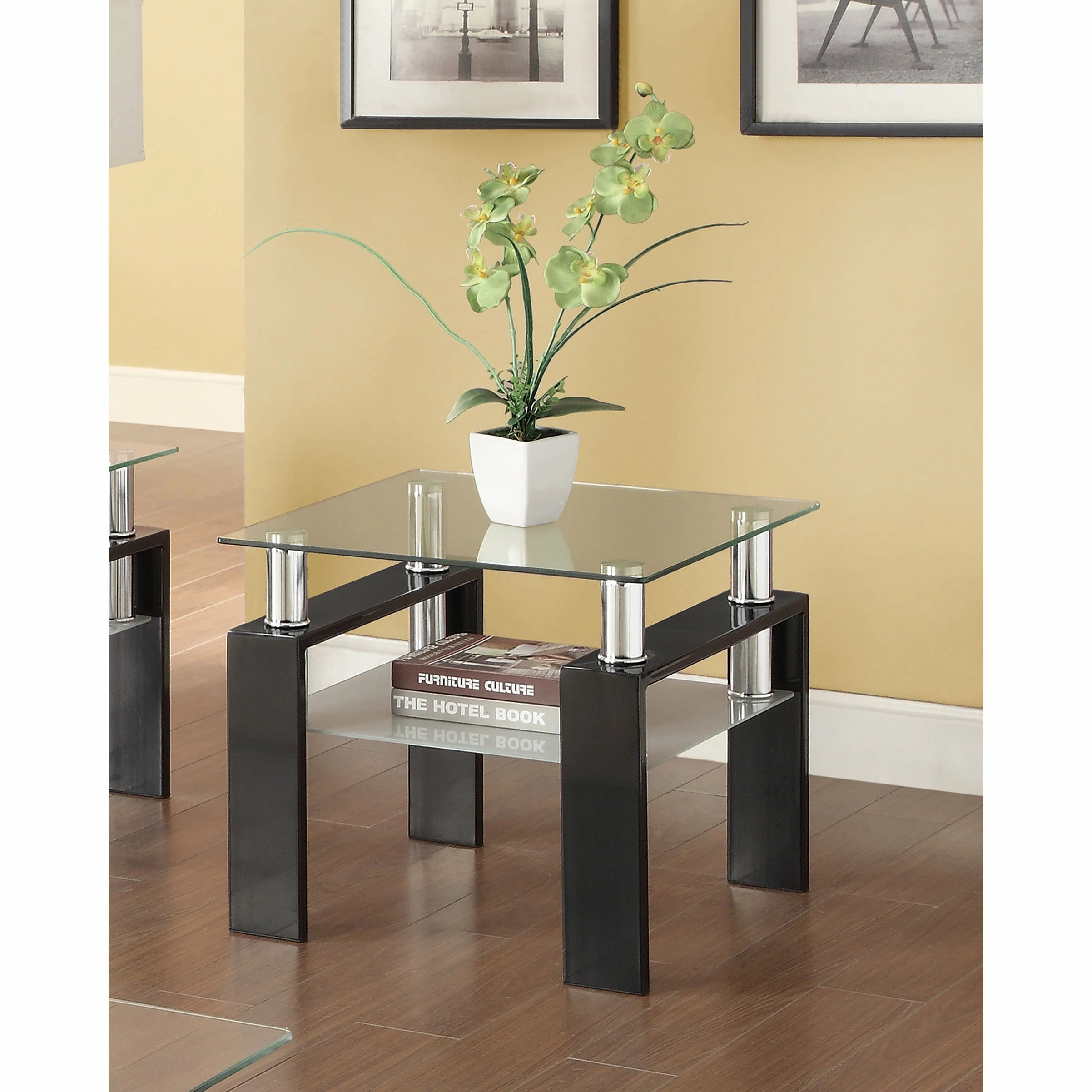 Denote a specific spot to display a lamp or framed photos with this contemporary end table by Coaster. A geometric metal frame makes this table highly sturdy and timelessly elegant, with a lower shelf for additional display space. The glass shelf and tabletop provide the ideal, translucent platform for decorative objects and essential peripherals.