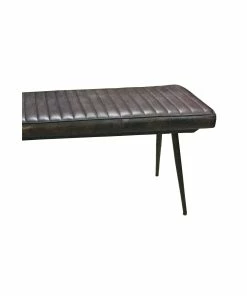 Place this expansive cushioned bench along with a dining table or at the foot of a bed for extra seating. Perfect for an industrial style loft apartment or modern farmhouse home, this bench offers padded cushion for complete comfort and support. The bench cushion even lends a vintage, boho-chic charm with a hand-dyed goat leather fabric in a dark espresso hue and a channel tufted design. Each end of the bench is supported by tapered and flared metal legs in a deep black finish. This bench is part of the Partridge collection, which also offers matching chairs, as well as a coordinating dining table and server.