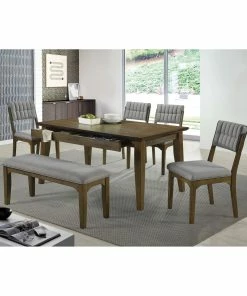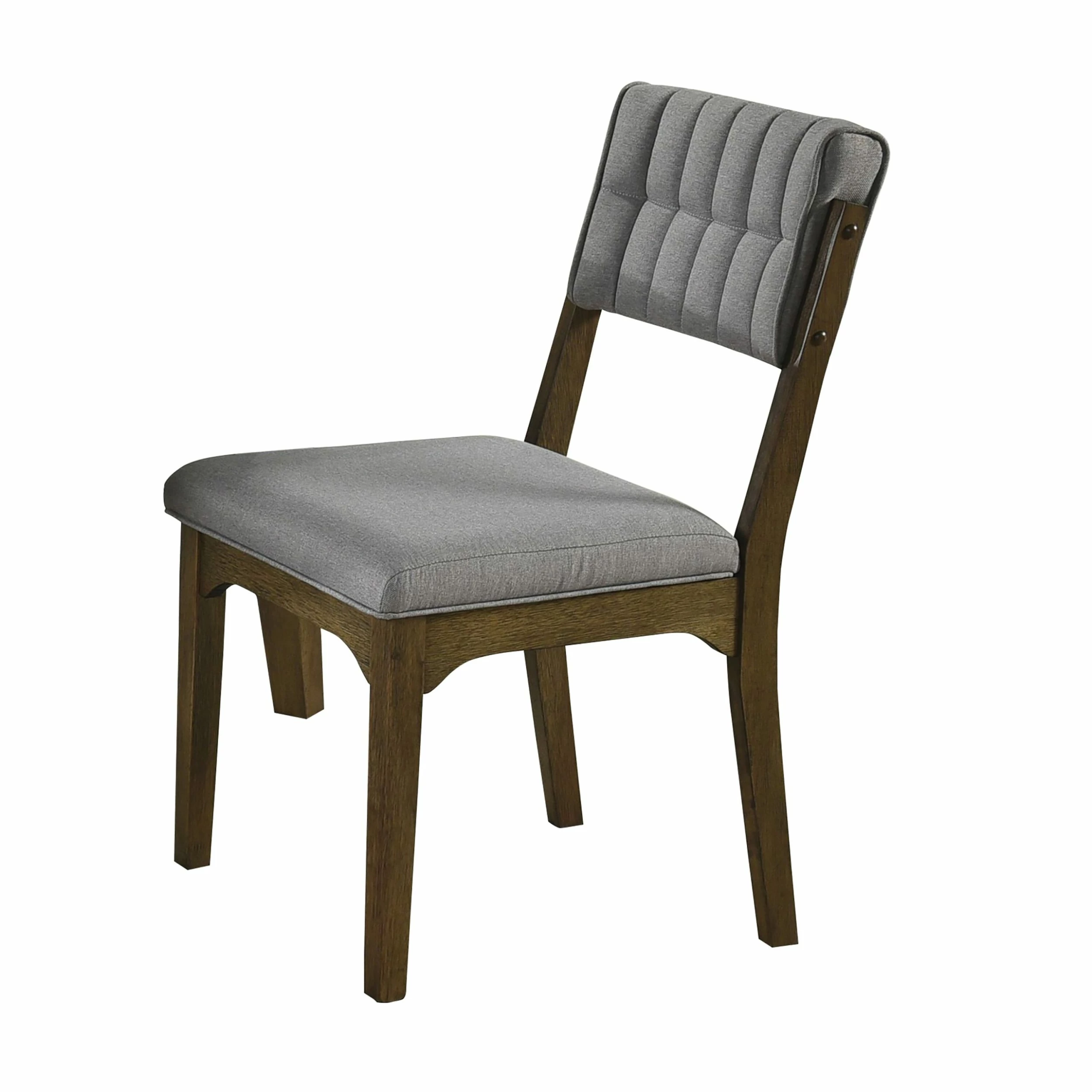 Pull up a pair of these retro-inspired chairs to a dining table for comfort all through dinner. Each chair is constructed of solid Asian hardwood for extra support and durability. The frame also features a medium brown finish that complements numerous color palettes and offers an earthy, rustic flair. A padded seat and padded backrest are wrapped in a grey fabric lined in welt trimming, and the padded back seat also offers understated tufting for a more vintage look. Within the same Rayleene collection is a matching dining table and bench, as well as counter height options in the same style.
