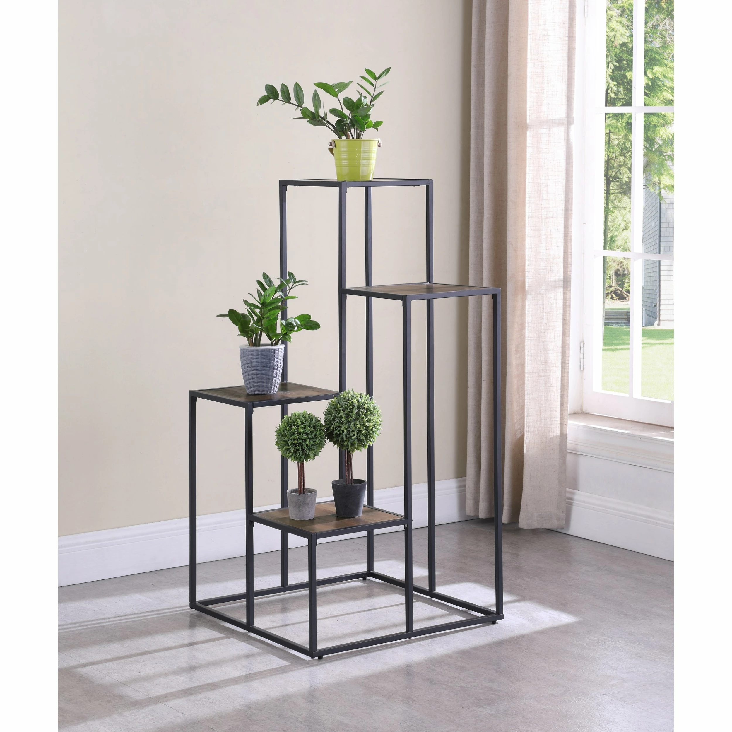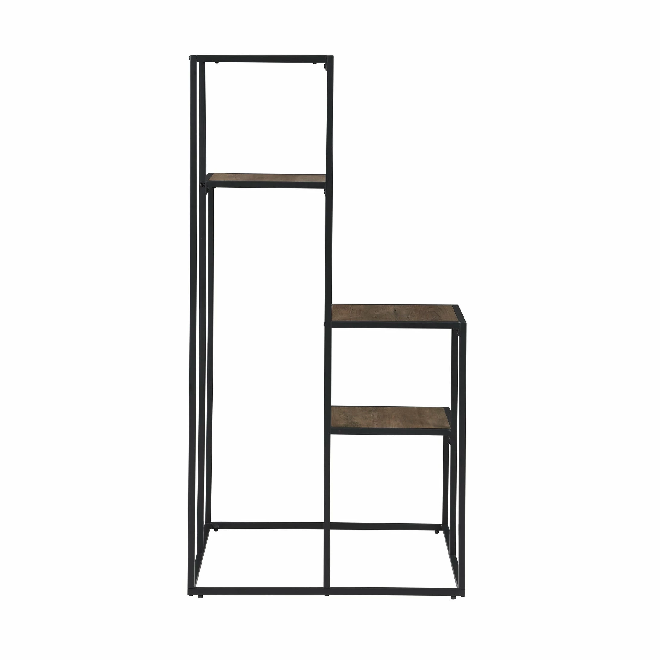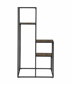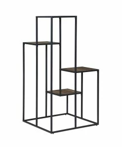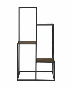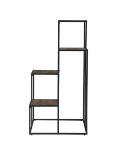 Make a statement with a tiered shelving unit. Four open shelves create the perfect place for displaying your favorite decor items. Its industrial design is enhanced with a black metal frame. Meanwhile, the rustic wood finish makes a contrast against the frame. Enhance your industrial or rustic style living room with this piece.