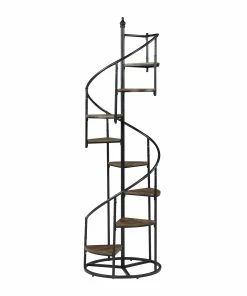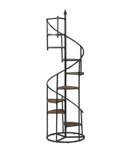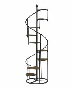 A unique black bookcase in a spiral design is sure to make your heart sing. Eight open shelves cascade down the frame of this rustic and industrial piece. The frame is crafted from metal with a black finish. The triangular shelves are finished in a warm wood color for contrast. Instantly enhance living areas and offices with this black rustic bookcase.