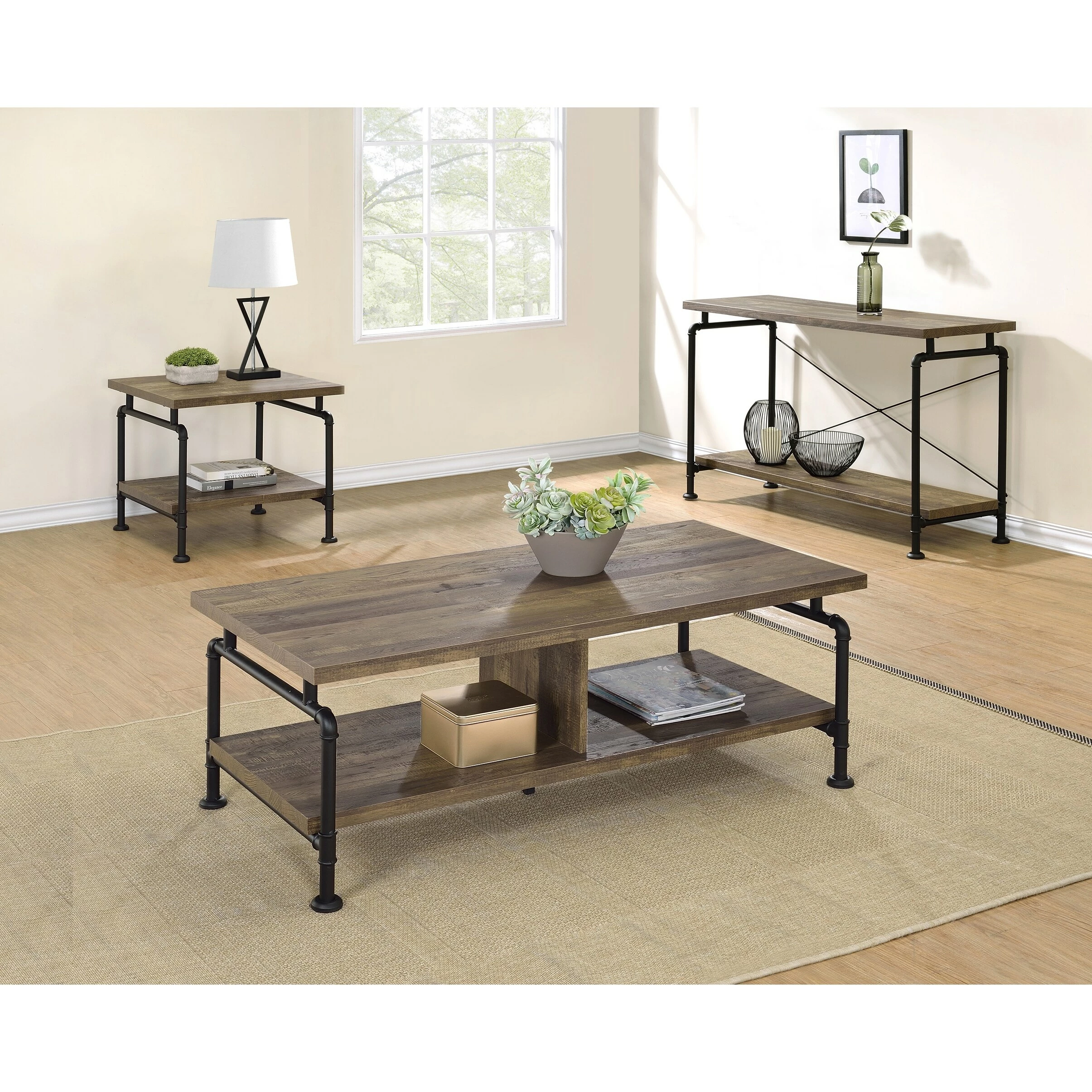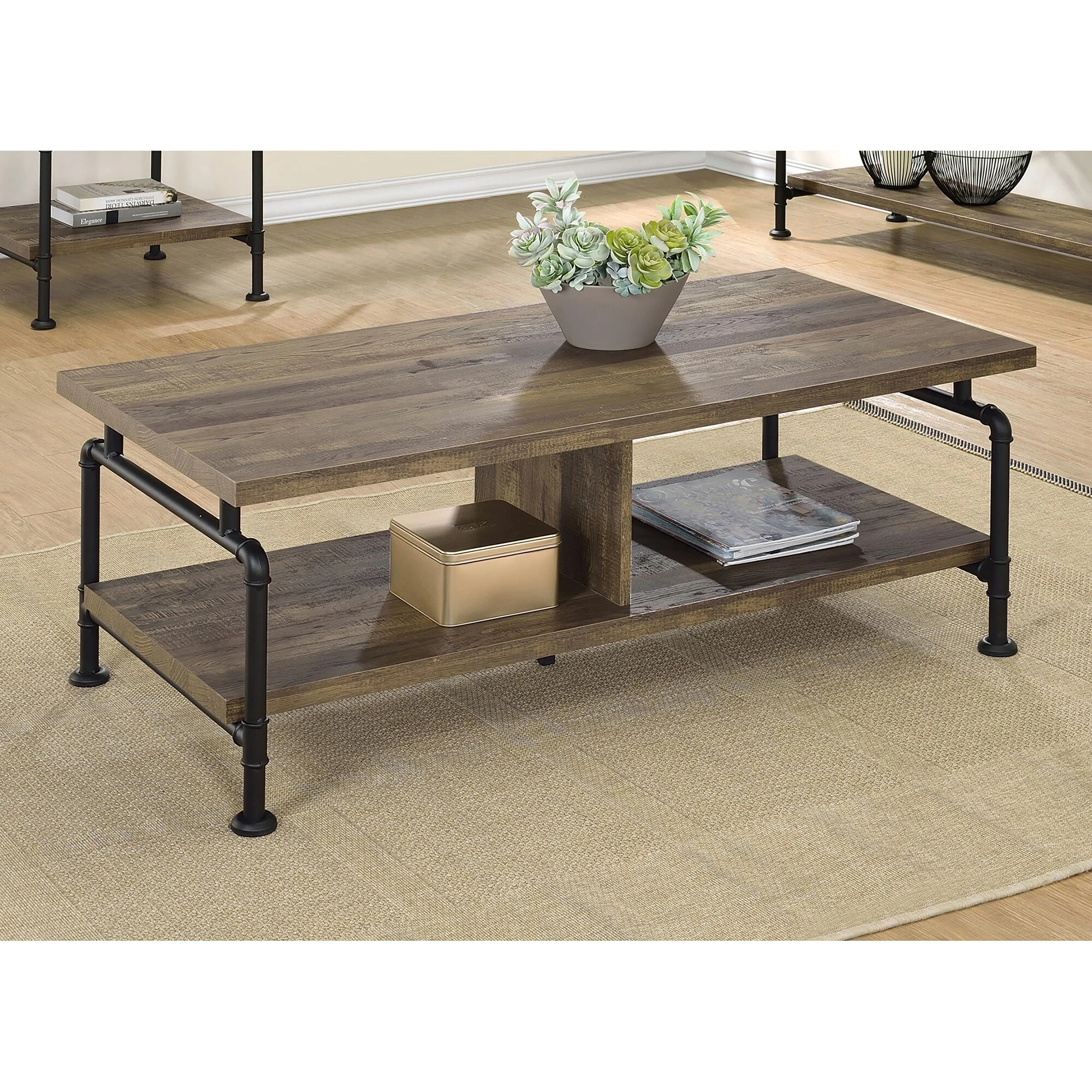 Supported by metal pipe styled legs in a black powder coat finish, this industrial style coffee table makes a charming addition. It’s the perfect complement to a compact loft apartment or modern farmhouse style home. Each tabletop surface is crafted of easy-to-maintain engineered wood and offers a rustic oak finish. Plus, the spacious lower storage shelf invites you to showcase photo books and keep baskets for remotes and electronic devices. A center support divides the lower shelf in two, adding visual interest and creating space for a range of storage and display purposes.