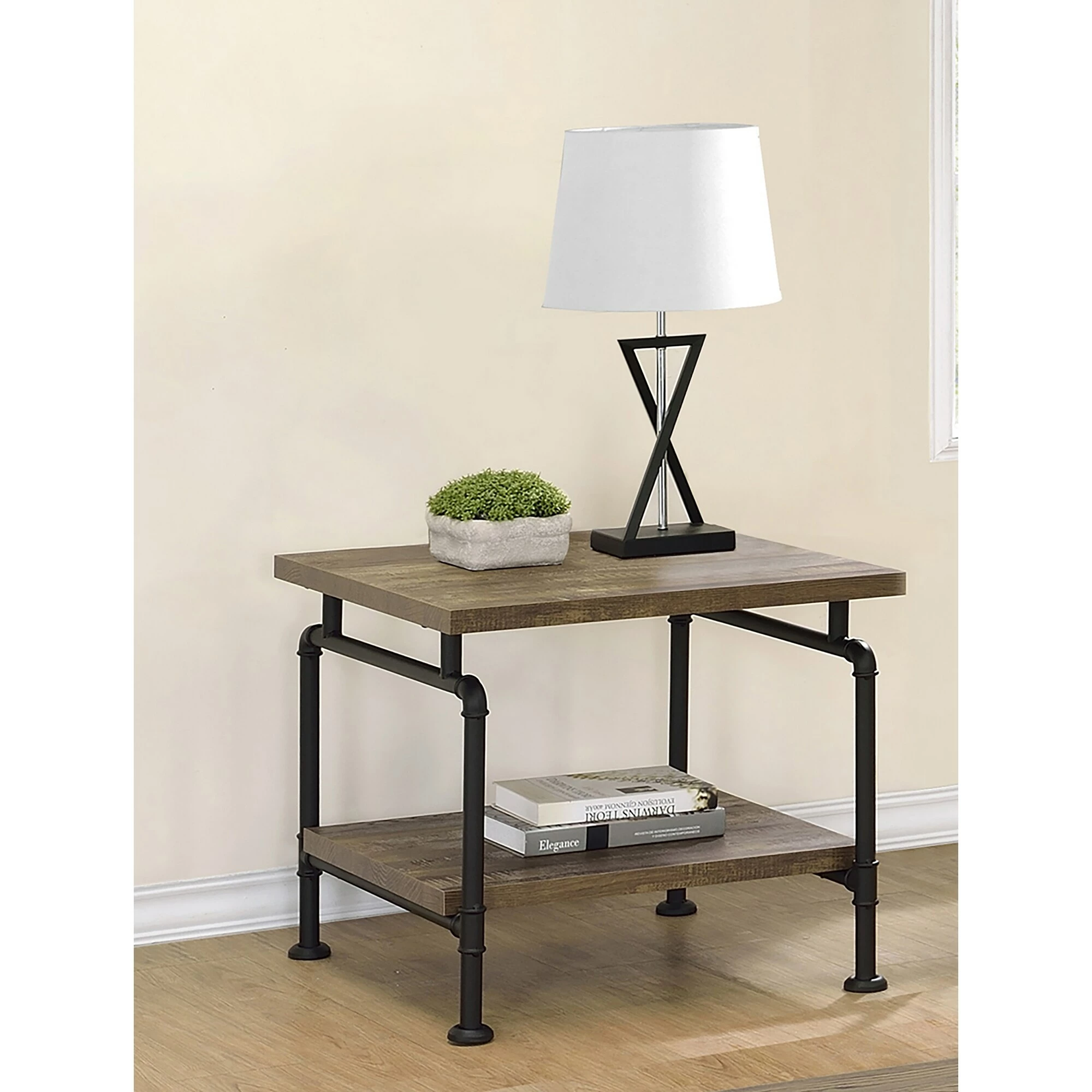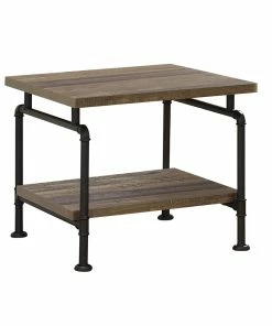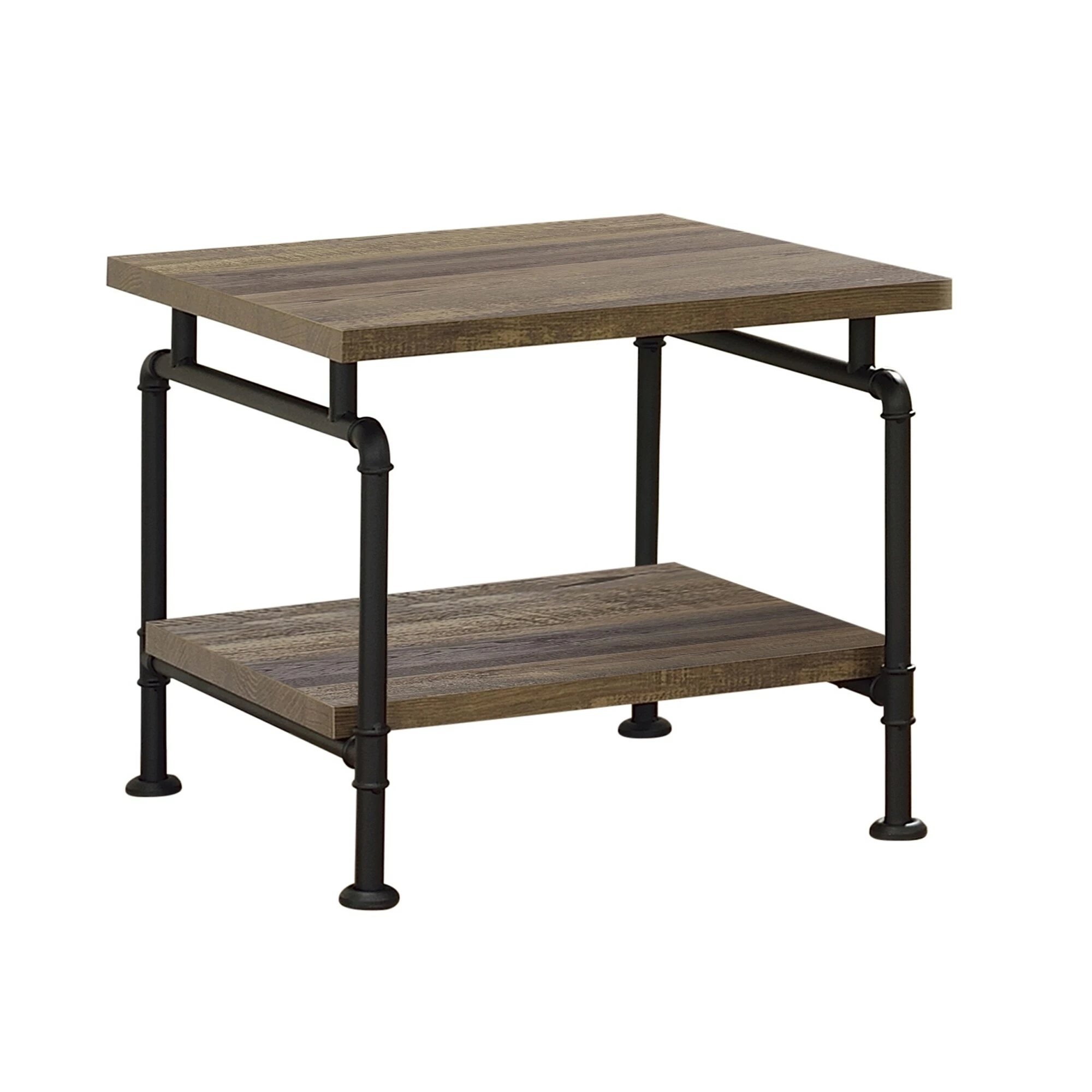 With mixed materials, this end table lends itself nicely to an industrial style loft apartment or modern farmhouse style home. Supported by metal industrial pipe styled legs in a black powder coat finish, it offers a striking contrast. Each tabletop surface is crafted of engineered wood and offers a rustic oak finish that lends a subtle country charm. In addition, a spacious lower storage shelf invites you to showcase photo books and cherished items. Place a pair of these end table next to a leather sofa for a handsome, refined look.