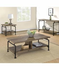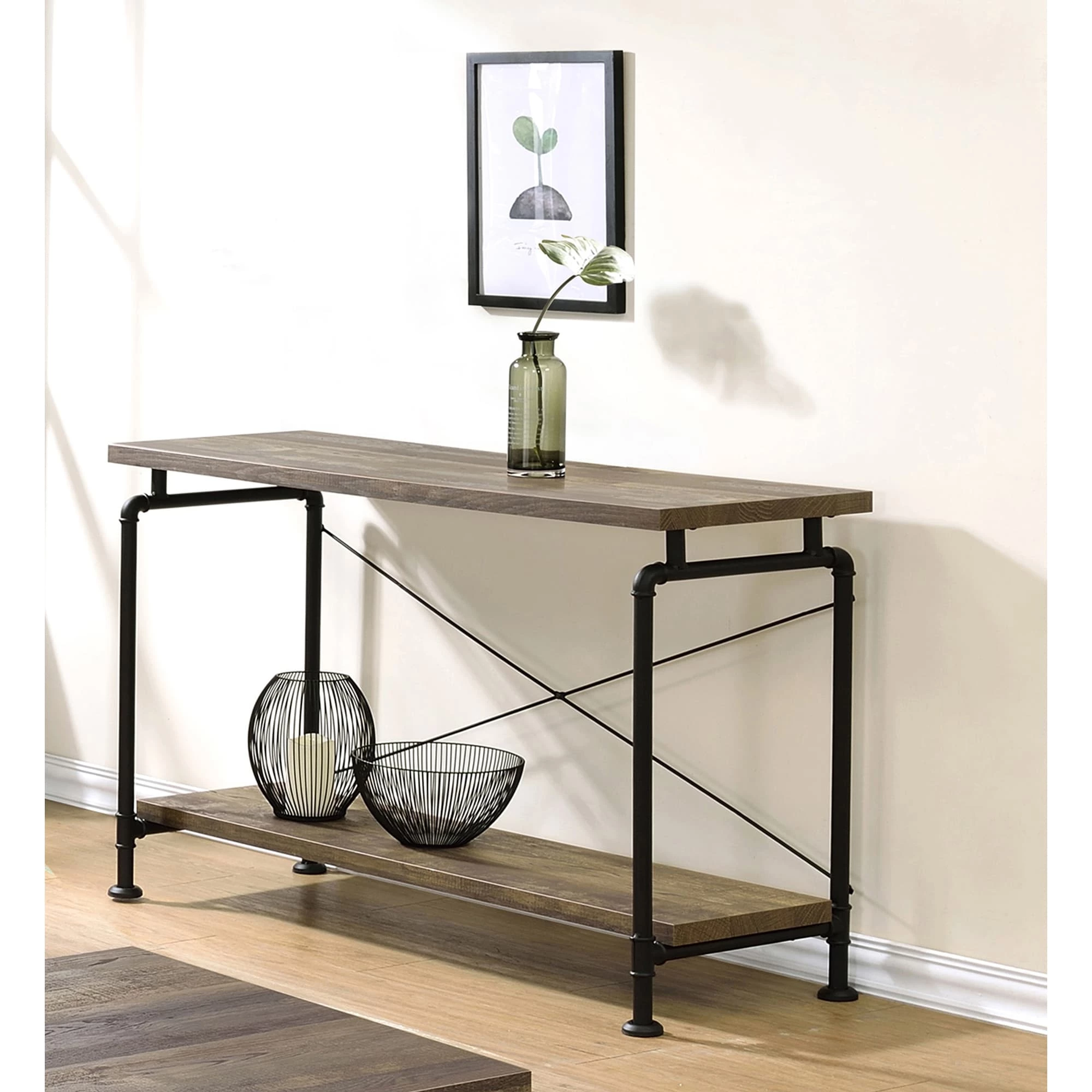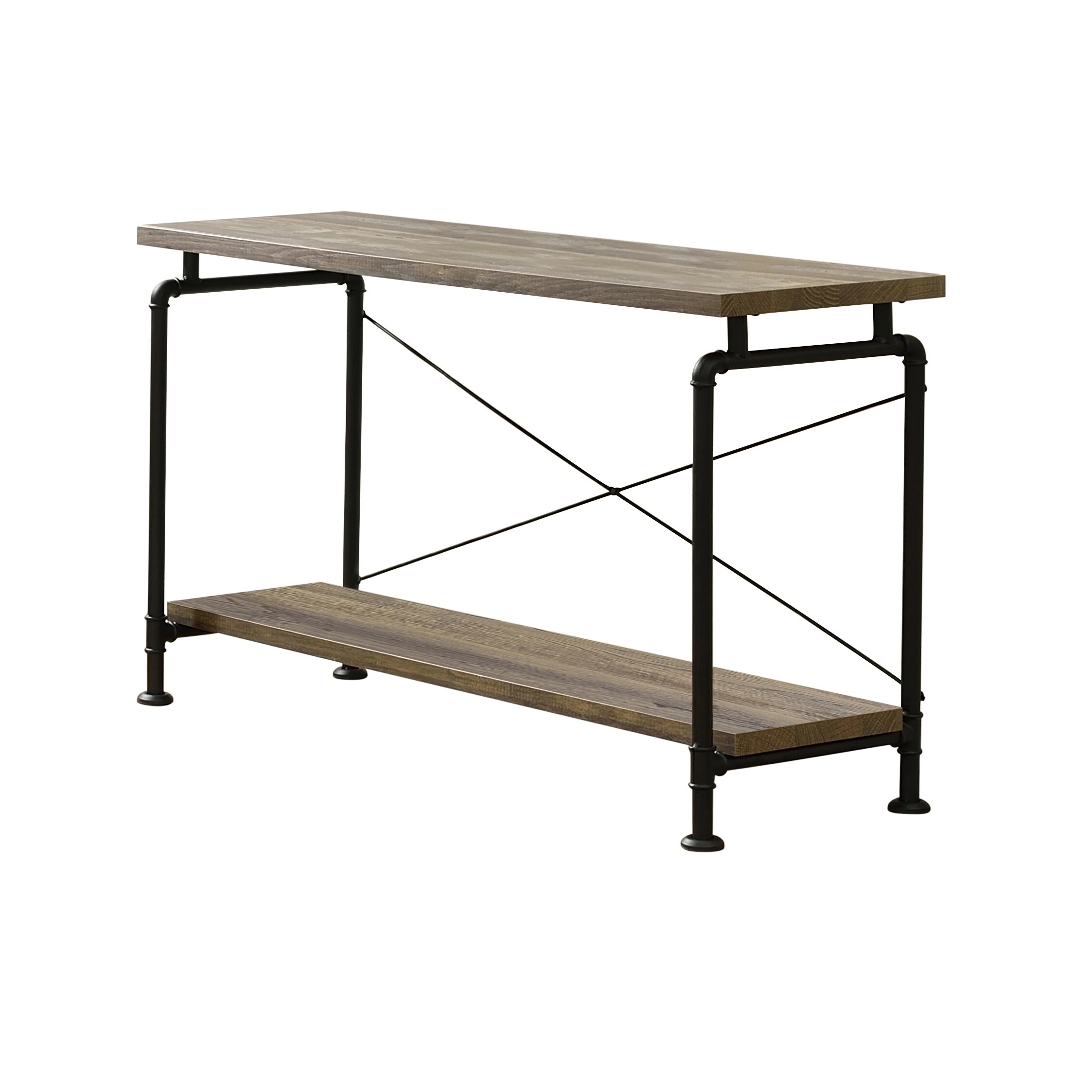 Enticingly industrial, this sofa table completes the appearance of your living space. Its expansive tabletop is finished in an eye-catching rustic oak. The black pipe-inspired trim provides a wonderful contrast to the tabletop. Lower shelves are available to store items or display decor. This piece is durably constructed from metal for years of enjoyment.