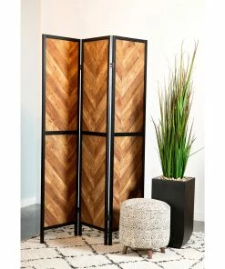 Whether you need privacy or an interesting backdrop, this three-panel screen is a delightful addition to your home. Its trifold design makes it easy to position as desired. This piece is beautifully finished in rustic tobacco with an attractive herringbone pattern. A black metal frame provides plenty of contrast. This piece is supported on block style legs.